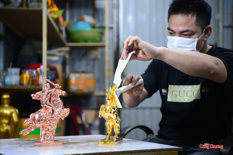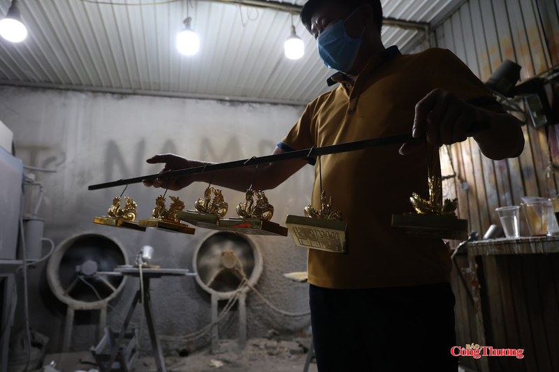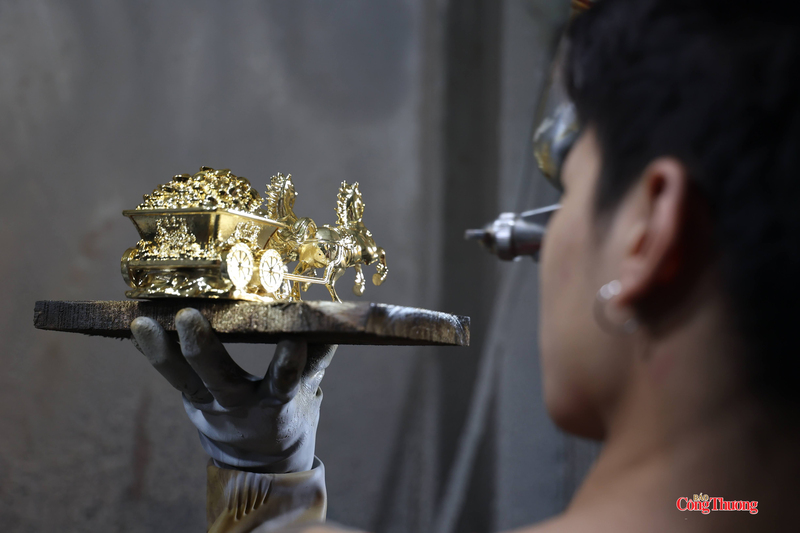 Công đoạn dát vàng thủ công được thực hiện tỉ mỉ, từng lớp vàng kim tạo nên sắc ánh rực rỡ cho linh vật. Ảnh: Lê Phú