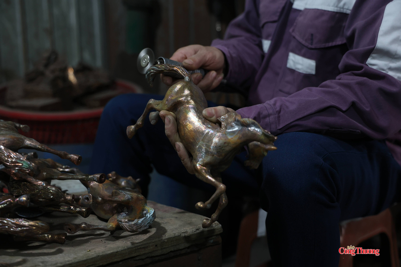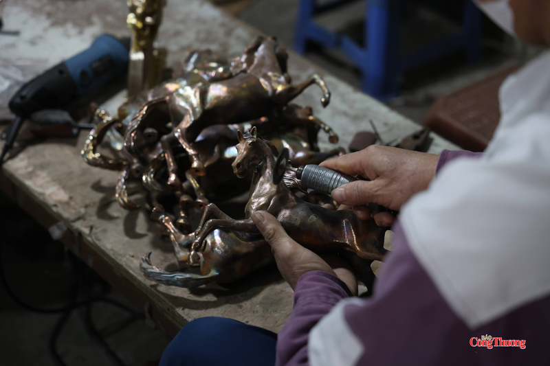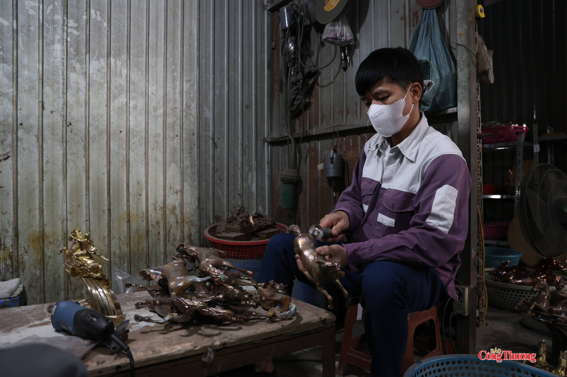 Với đôi bàn tay khéo léo, người thợ đang chỉnh sửa từng chi tiết linh vật sau công đoạn đúc, bảo đảm độ chính xác và liền mạch của sản phẩm. Ảnh: Lê Phú
