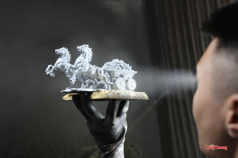 Để tạo nên một tác phẩm linh vật hoàn chỉnh như “Phi Mã Thánh Gióng”, quá trình chế tác phải trải qua nhiều công đoạn phức tạp, đòi hỏi sự phối hợp nhịp nhàng giữa nghệ thuật điêu khắc và tay nghề thủ công truyền thống. Ảnh: Lê Phú