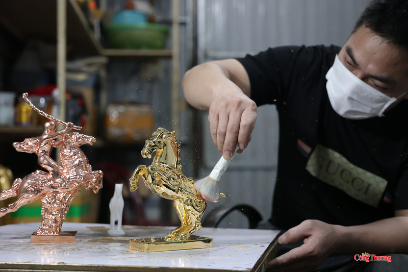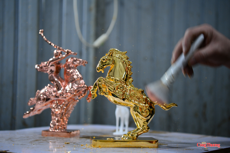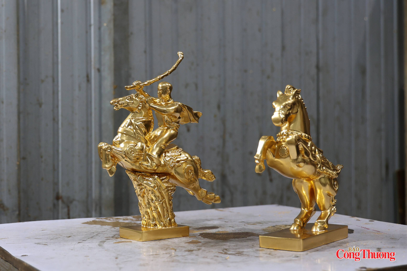 Tông màu vàng kim chủ đạo không chỉ tạo hiệu ứng thị giác sang trọng mà còn hoàn thiện thông điệp về chiến thắng, thịnh vượng và vị thế vững bền. Theo xưởng chế tác, đây cũng là yếu tố khiến tác phẩm được nhiều người tiêu dùng lựa chọn làm quà biếu hoặc trưng bày trong dịp đầu năm. Ảnh: Lê Phú
