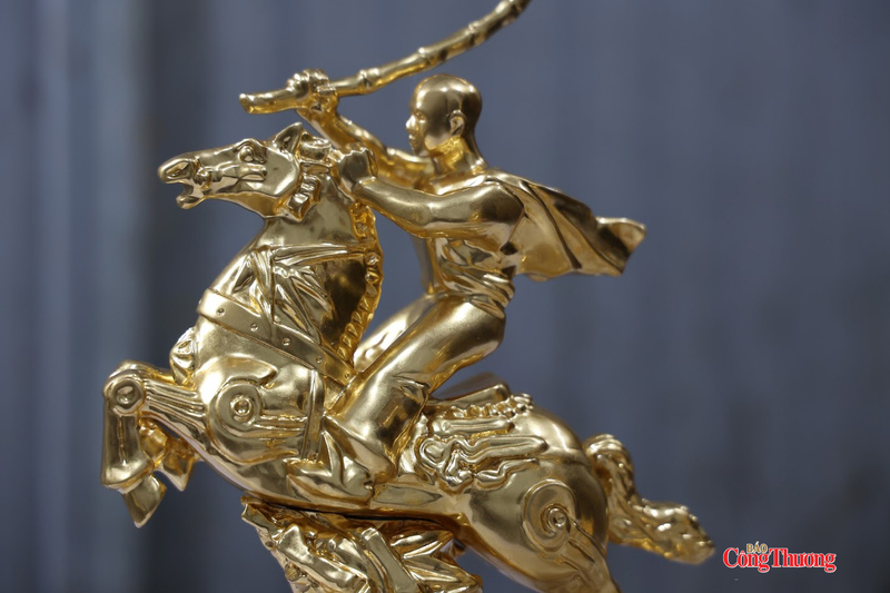 Điểm nhấn đáng chú ý trong mùa Tết Nguyên đán năm nay là tác phẩm mang tên “Phi Mã Thánh Gióng”, được đúc theo mẫu thiết kế của nhà điêu khắc, họa sĩ Vũ Dũng. Tác phẩm kết hợp giữa chất liệu sơn mài truyền thống, đồng và kỹ thuật dát vàng 24K, toàn bộ các công đoạn quan trọng đều được thực hiện thủ công bởi những người thợ lành nghề.