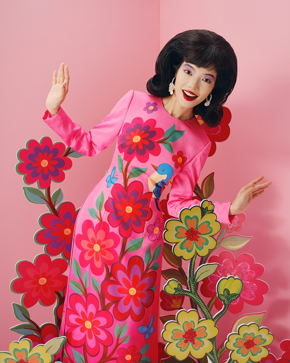 Trong cách tiếp cận của Thủy Nguyễn, áo dài không chỉ được thiết kế để mặc mà được dàn dựng như một không gian văn hóa. Mỗi mẫu áo là một “khung cảnh”, nơi hoa lá, linh vật, màu sắc và tỷ lệ hình khối được sắp đặt với tư duy của một người làm nghệ thuật thị giác hơn là thuần thời trang.