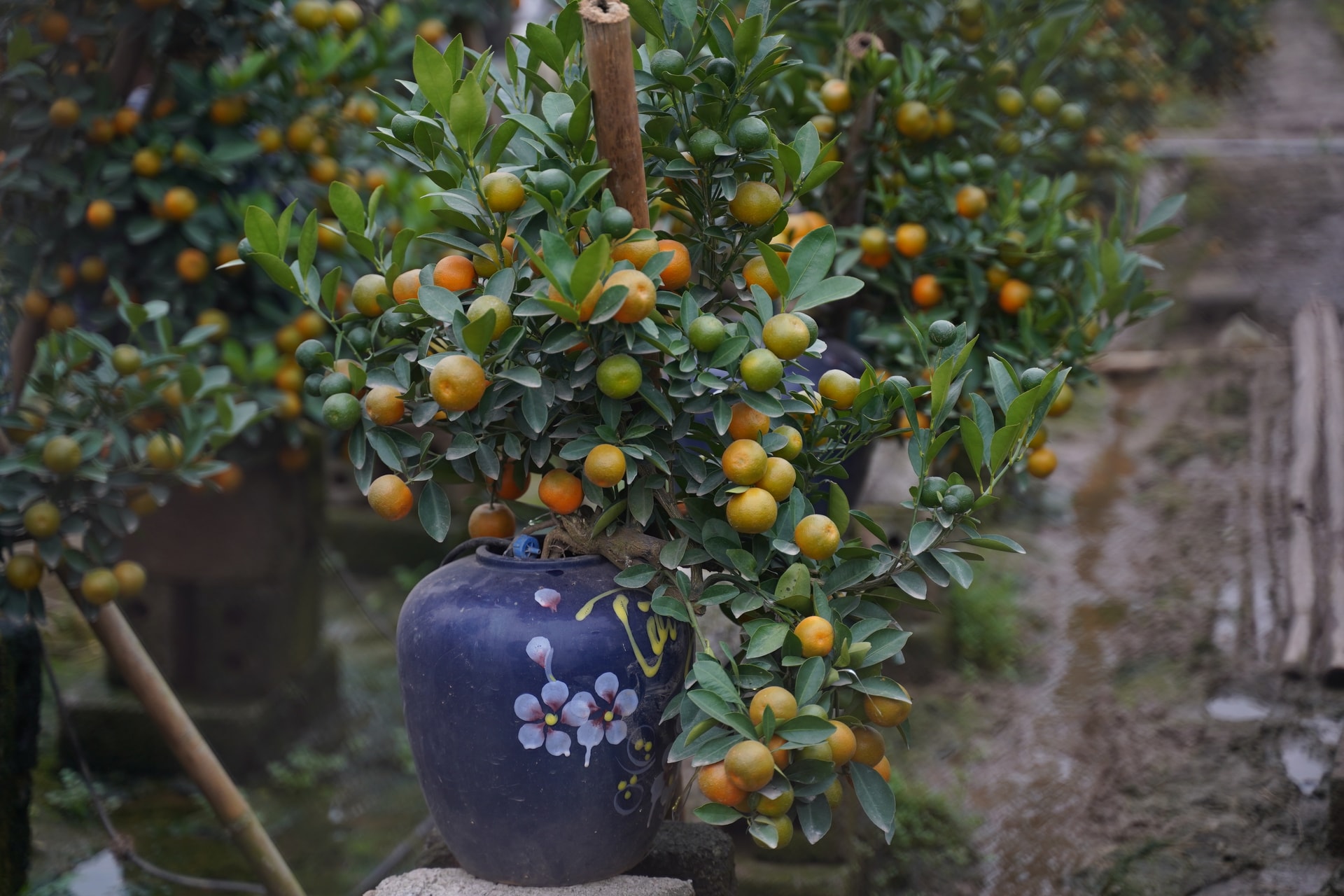 Những cây quất cổ thụ được tạo tác trong nhiều năm với quy trình ghép nhiều tầng (bưởi - quýt - quất), đòi hỏi kỹ thuật cao và thời gian chăm sóc dài hạn.