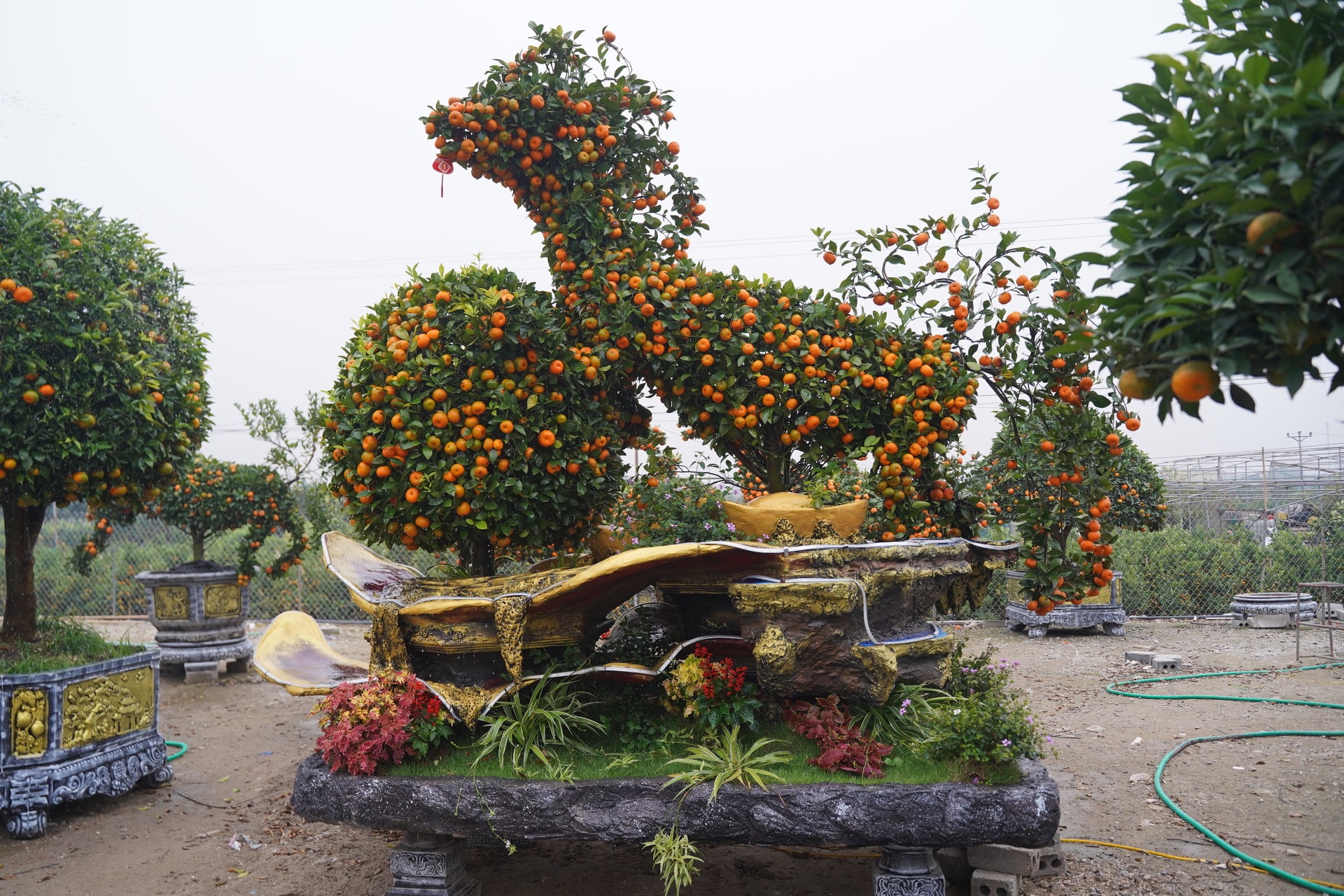 Một cây quýt tạo hình linh vật ngựa được trưng bày tại vườn nhà ông Hoàng Chu Nguyên (xã Văn Giang). Dáng cây được uốn thủ công hoàn toàn, thân vươn dài, đầu ngẩng cao, phủ dày quả chín đỏ cam.