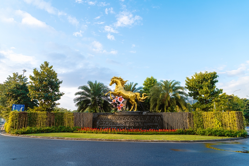 Để hoàn thành tác phẩm Ngựa Vàng cao 5m này, nghệ nhân Đinh Văn Tâm cùng đội ngũ cộng sự đã miệt mài làm việc xuyên suốt hơn một tháng ròng rã. Tác phẩm được xây dựng dựa trên sự kiên cố của khung sắt chịu lực bên trong, bao phủ bởi hơn 60m² alu vàng rực rỡ. Đáng chú ý, để tạo nên bề mặt hoàn hảo và sống động, các nghệ nhân đã tỉ mỉ cắt ghép từ 150.000 tấm alu nhỏ, giúp linh vật vừa giữ được vẻ uy nghi, vững chãi, vừa tạo hiệu ứng phản chiếu ánh sáng lung linh, mang lại điểm nhấn thẩm mỹ dịu mắt cho không gian cửa ngõ hàng không. Từng đường nét từ bờm ngựa đến cơ bắp đều được chăm chút tỉ mỉ từ hàng trăm nghìn mảnh ghép đó, toát lên tinh thần dũng mãnh nhưng vẫn đầy sự thanh thoát, gần gũi.