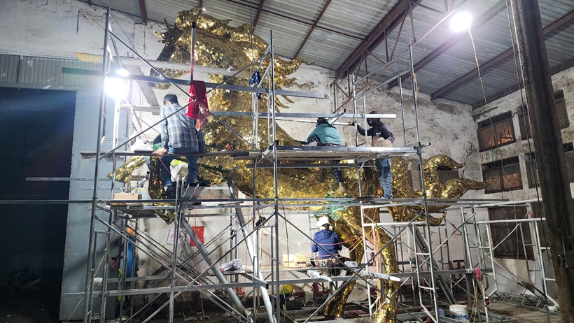 Quá trình miệt mài hoàn thiện tác phẩm Ngựa vàng cao 5m tại xưởng của nghệ nhân Đinh Văn Tâm trước khi "cập bến" sân bay Quốc tế Đà Nẵng.