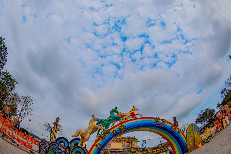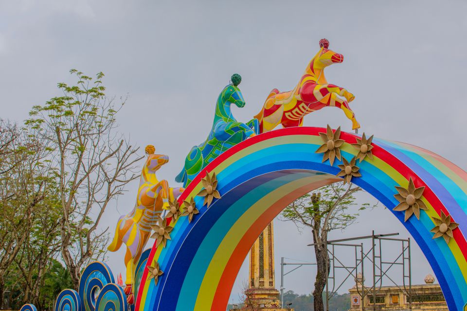 Cách sắp đặt khiến các linh vật ngựa mang vẻ không đứng im một chỗ, con thì như đang tung vó giữa rừng hoa, con thì đứng đối nhau ngay lối đi. Nhìn từ xa, cứ có cảm giác như cả đàn ngựa đang lướt đi trên thảm hoa pháo với cúc vạn thọ. Gam màu đỏ, vàng phối với xanh lam phảng phất cái màu của mấy bức tranh làng Sình hay họa tiết trên áo dài cung đình ngày xưa, lạ mà quen.
