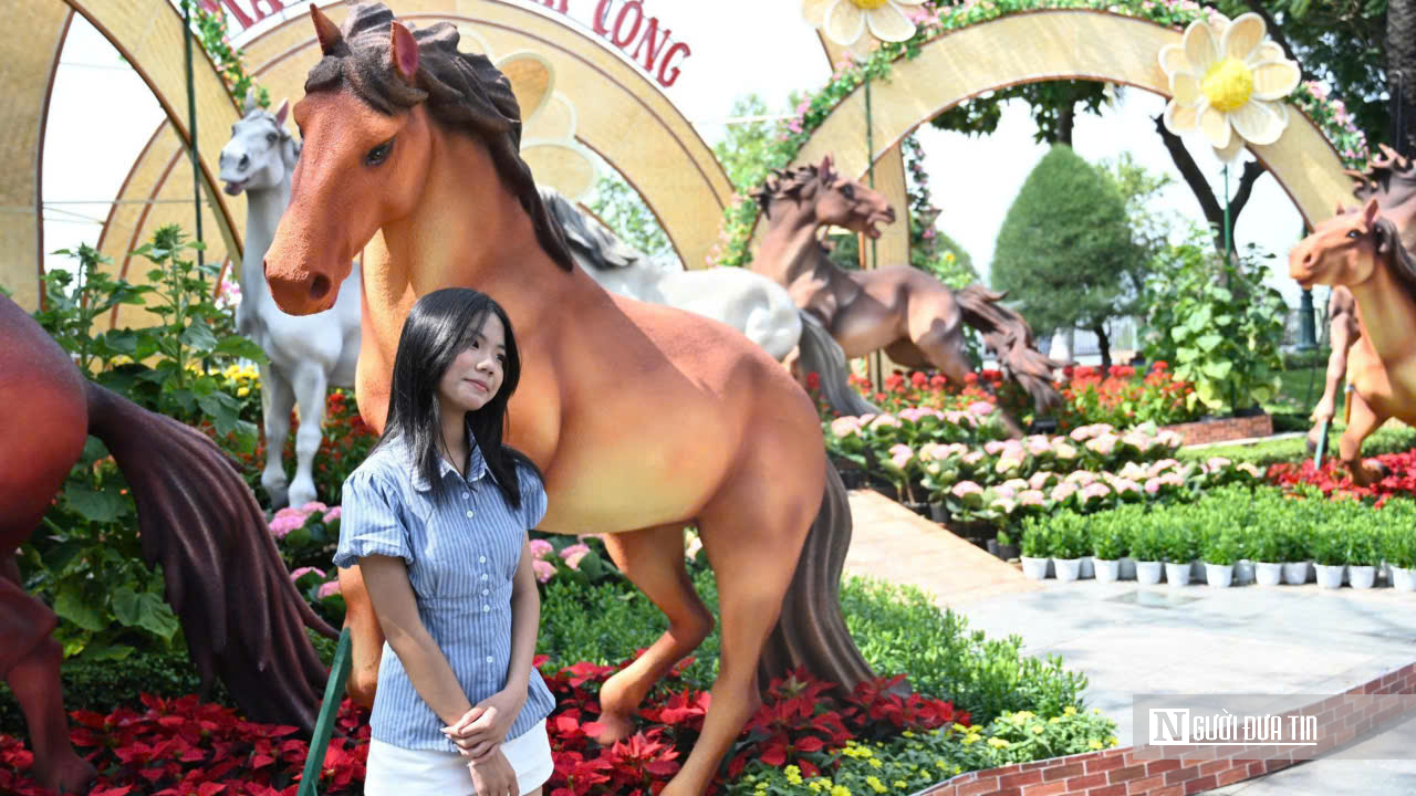 Theo quan sát của phóng viên, khu vực trưng bày linh vật luôn trong tình trạng nhộn nhịp. Nhiều nhóm bạn trẻ chuẩn bị trang phục áo dài truyền thống, phụ kiện Tết để có những bức ảnh ưng ý. Không khí rộn ràng tiếng cười nói, tiếng máy ảnh, điện thoại chụp hình liên hồi tạo nên bức tranh xuân đầy sức sống.