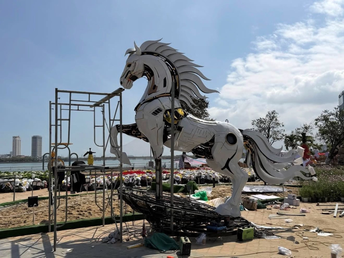 Khác với những linh vật truyền thống, "Kim Mã 4.0" cao 4,3m, dài 5,1m, được thiết kế theo phong cách hiện đại với các đường nét gọn gàng, khỏe khoắn. Thân ngựa "lộ" hệ thống vi mạch, bánh răng và khung xương thép, mô phỏng một robot thực thụ. (Ảnh: Tổng hợp mạng xã hội)