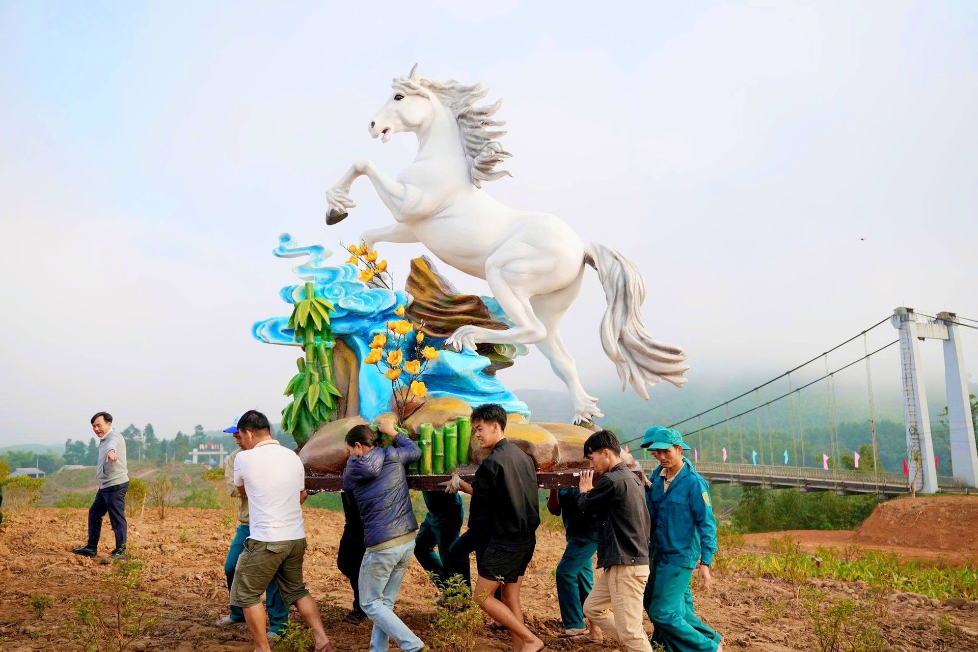 Tư thế ngựa tung vó vượt qua những vách đá cheo leo, bồng bềnh giữa mây ngàn và khóm tre xanh đã tạo nên một tổng thể hài hòa, hùng vĩ, gợi mở khí thế vươn lên mạnh mẽ trong năm mới.