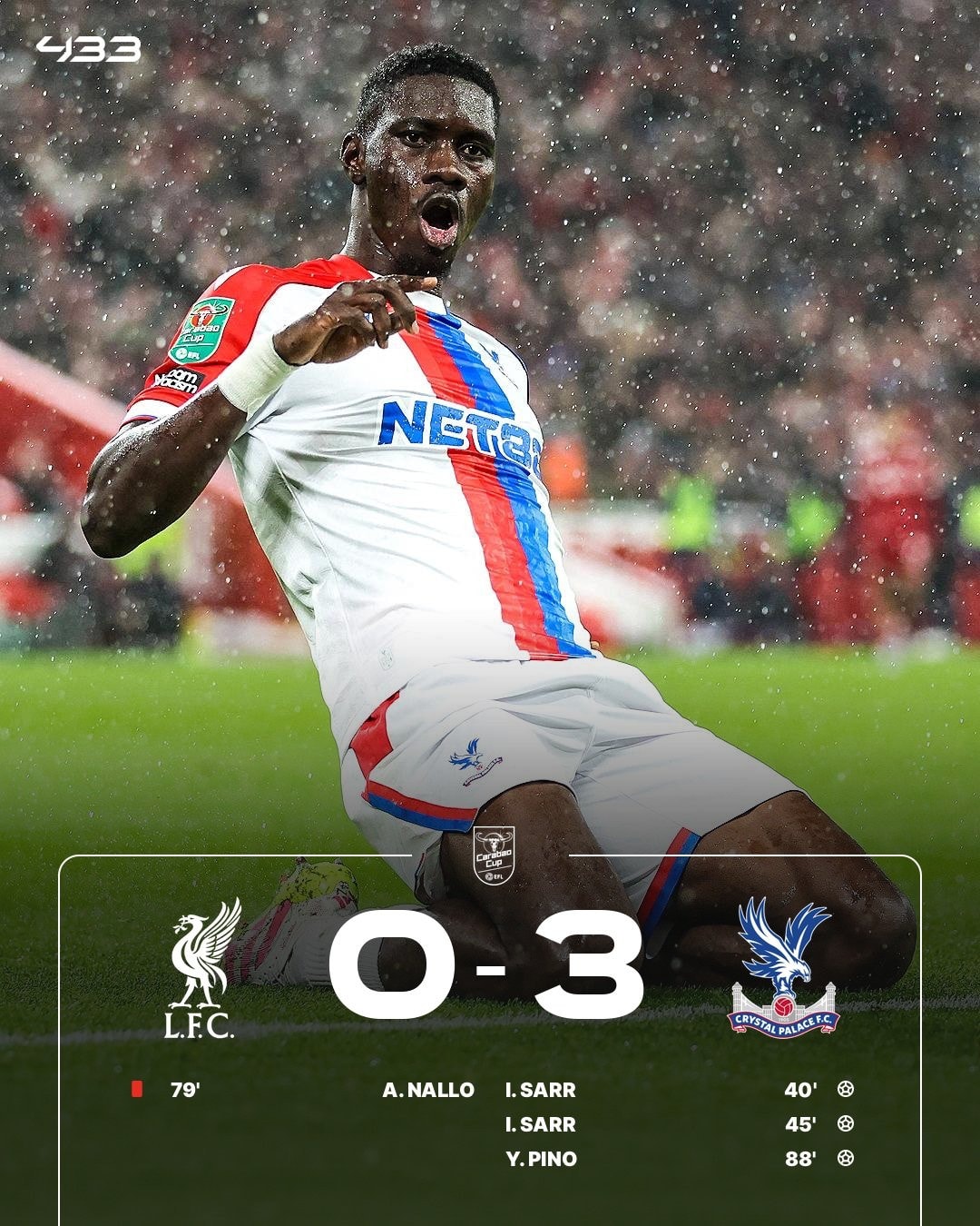 Một Anfield choáng váng. Liverpool, với đội hình xuất phát gồm nhiều cầu thủ dự bị, để thua Crystal Palace 0-3 ở vòng 4 Cúp Liên đoàn Anh. Ismaila Sarr ghi hai bàn ngay trong hiệp một, trước khi Yeremi Pino ấn định kết quả ở cuối trận. Đây là chiến thắng thứ ba liên tiếp của Palace trước Liverpool trong mùa giải này, còn thầy trò Arne Slot thua 6/7 trận gần nhất.