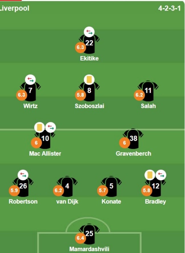 Florian Wirtz là điểm sáng hiếm hoi nhờ khả năng giữ bóng và xử lý kỹ thuật, nhưng anh thiếu sự liên kết để mở ra những cơ hội rõ ràng. Mohamed Salah chơi năng nổ trong điều kiện thiếu hỗ trợ, tạo ra tình huống nguy hiểm từ quả phạt góc dẫn đến bàn thắng không được công nhận.