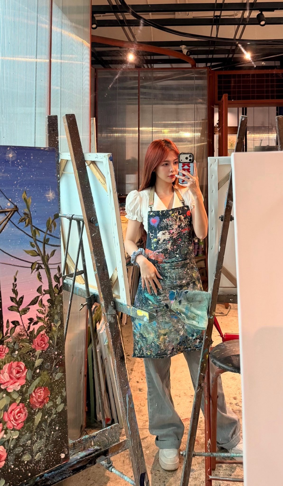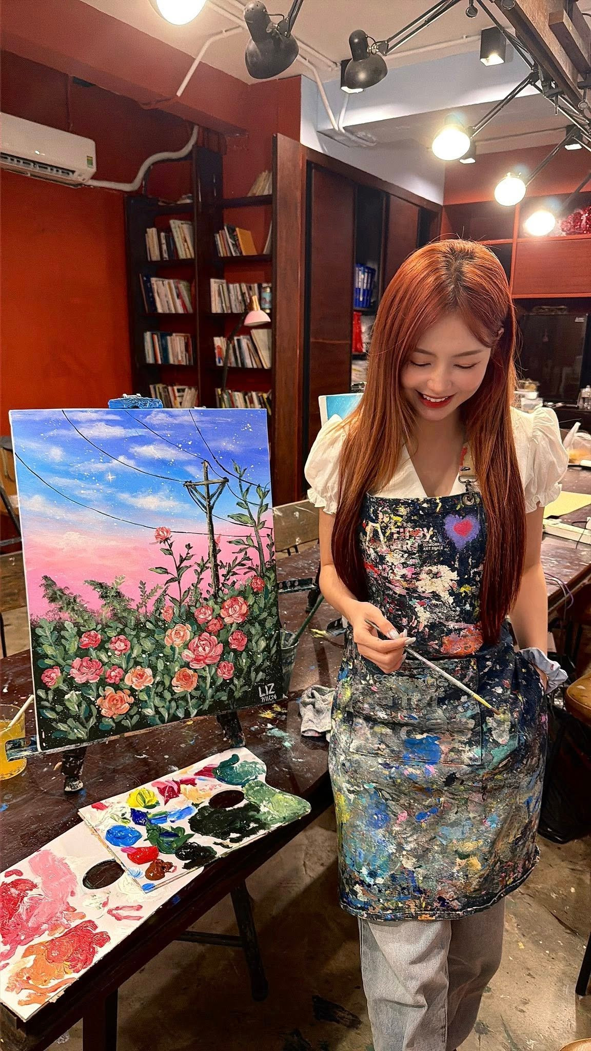 Trong những bức ảnh được chia sẻ, Liz Kim Cương diện trang phục giản dị, khoác tạp dề vẽ loang màu sơn, tạo cảm giác gần gũi và đầy chất nghệ sĩ.