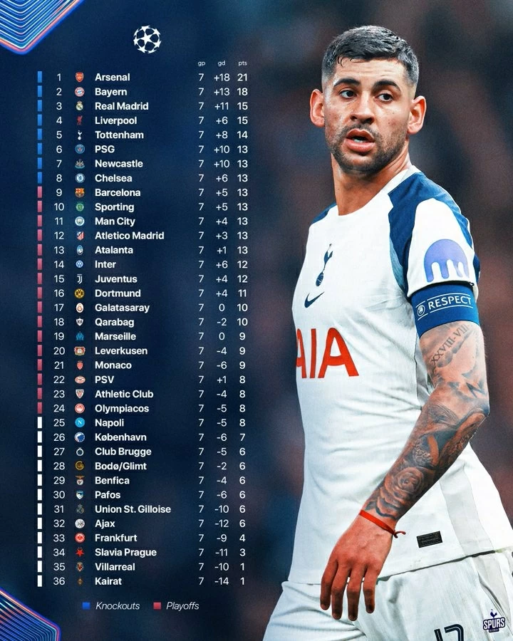 Sảy chân đáng tiếc tại Istanbul, Atletico Madrid bị đẩy khỏi top 8, tụt từ vị trí thứ 8 xuống thứ 12. Dù có cùng 13 điểm với PSG, Newcastle, Chelsea, Barcelona, Man City và Sporting Lisbon, nhưng thầy trò HLV Diego Simeone xếp sau các đối thủ này do kém chỉ số phụ (hiệu số bàn thắng bại của Atletico là +3).