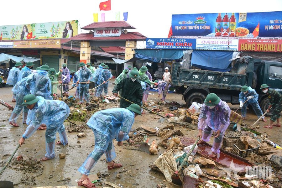 Bộ đội Sư đoàn 968 dọn bùn đất, thu gom rác thải tại chợ Tây Lộc, phường Phú Xuân.
