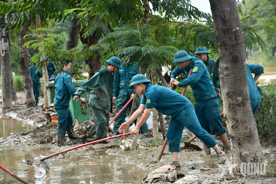 Dân quân phường An Cựu dọn bùn đất trên các tuyến đường.