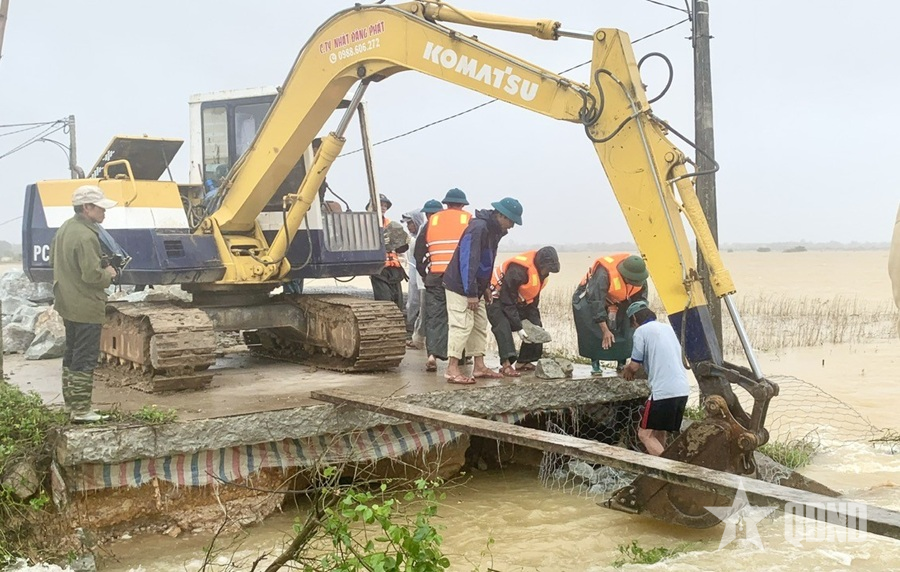 Cán bộ, chiến sĩ LLVT TP Huế tham gia khắc phục sự cố vỡ đê ở thôn Niêm Phò, xã Quảng Điền.
