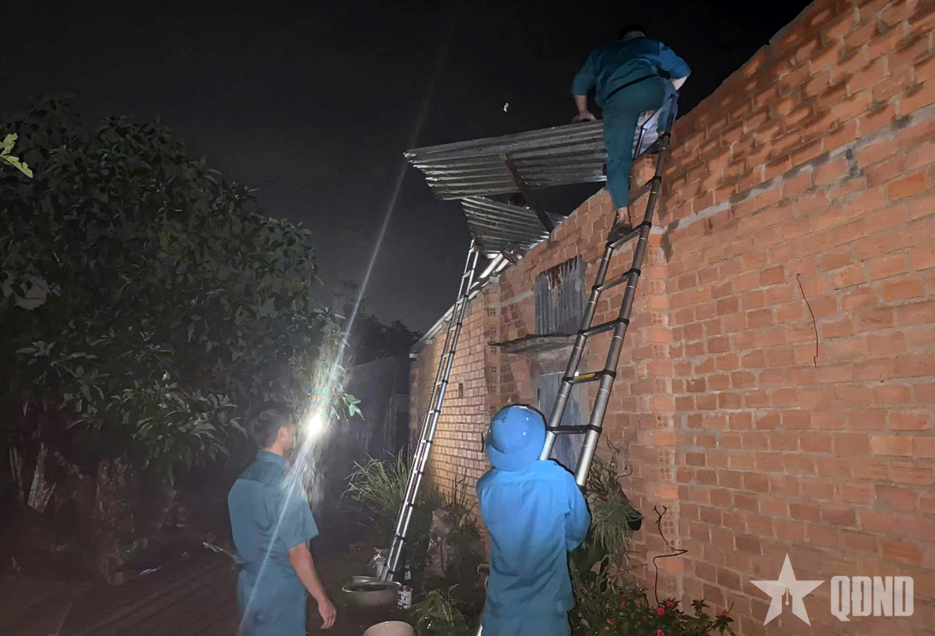 Cán bộ, chiến sĩ giúp người dân sửa chữa nhà trong tối ngày 8 và sáng 9-4.