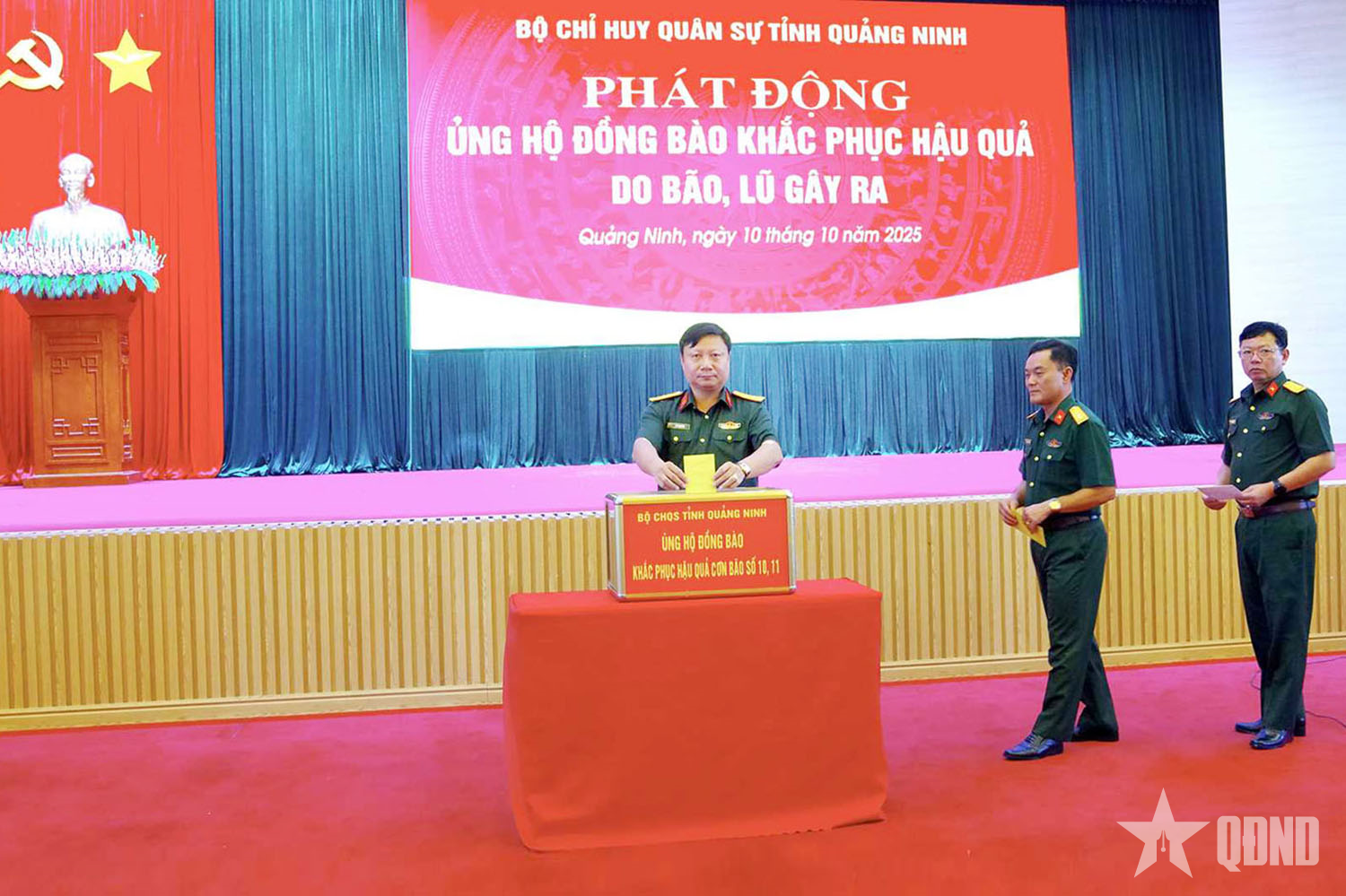 Đại tá Lê Trọng Hòa, Ủy viên Ban Thường vụ Tỉnh ủy, Chỉ huy trưởng Bộ CHQS tỉnh cùng cán bộ, chiến sĩ đơn vị tham gia quyên góp, ủng hộ đồng bào các tỉnh, thành phố khắc phục hậu quả do cơn bão số 10, 11 gây ra.