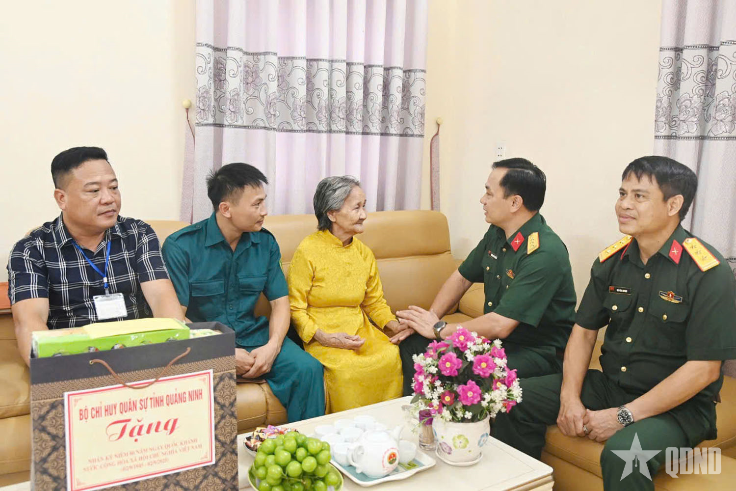 Đại tá Hoàng Văn Thuyết, Tỉnh ủy viên, Phó bí thư Thường trực Đảng ủy, Chính ủy Bộ CHQS tỉnh thăm, tặng quà Bà mẹ Việt Nam anh hùng Nguyễn Thị Thuộc, sinh năm 1937, tổ 5, khu 1, phường Hà Tu.
