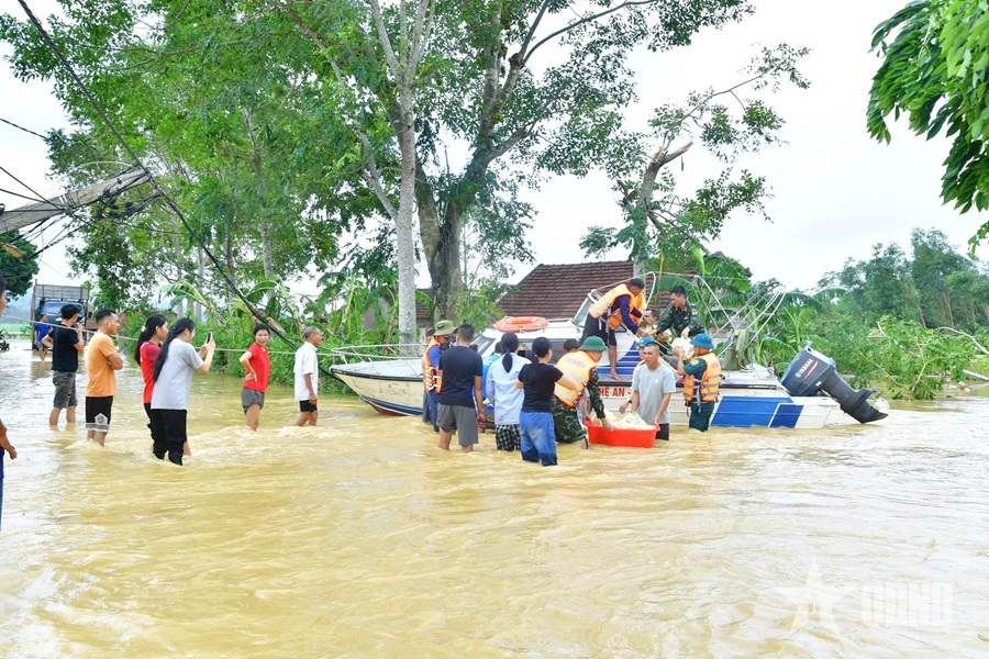 Ngày 2-10, trên địa bàn xã Tân An, tỉnh Nghệ An, nước lũ chưa rút hết. Giữa mênh mông biển nước, từng đoàn cán bộ, chiến sĩ Bộ CHQS tỉnh Nghệ An, nhất là Ban chỉ huy PTKV 5-Anh Sơn cùng lực lượng dân quân tự vệ kiên trì bám địa bàn, giúp dân vượt qua khó khăn. Lũ trên sông Con dâng cao khiến 13/21 xóm của xã bị ngập nặng, trong đó 7 xóm bị cô lập hoàn toàn. Gần 500 ngôi nhà chìm sâu trong nước. Bộ đội, dân quân chia thành nhiều mũi, dùng xuồng, ca nô, xe chuyên dụng để tiếp tế lương thực, nước uống, đưa người già, trẻ nhỏ, phụ nữ đến nơi an toàn. Những ngày qua, hơn 60 cán bộ, chiến sĩ bộ đội thường trực cùng hơn 700 dân quân tự vệ phối hợp chặt chẽ với chính quyền địa phương, không chỉ di chuyển người và tài sản mà còn trực tiếp san dọn, dựng lại những căn nhà tốc mái, hư hỏng. Khi màn đêm buông xuống, nước sông Con bắt đầu rút, lực lượng quân sự vẫn duy trì trực, không để người dân đơn độc trong bão, lũ.