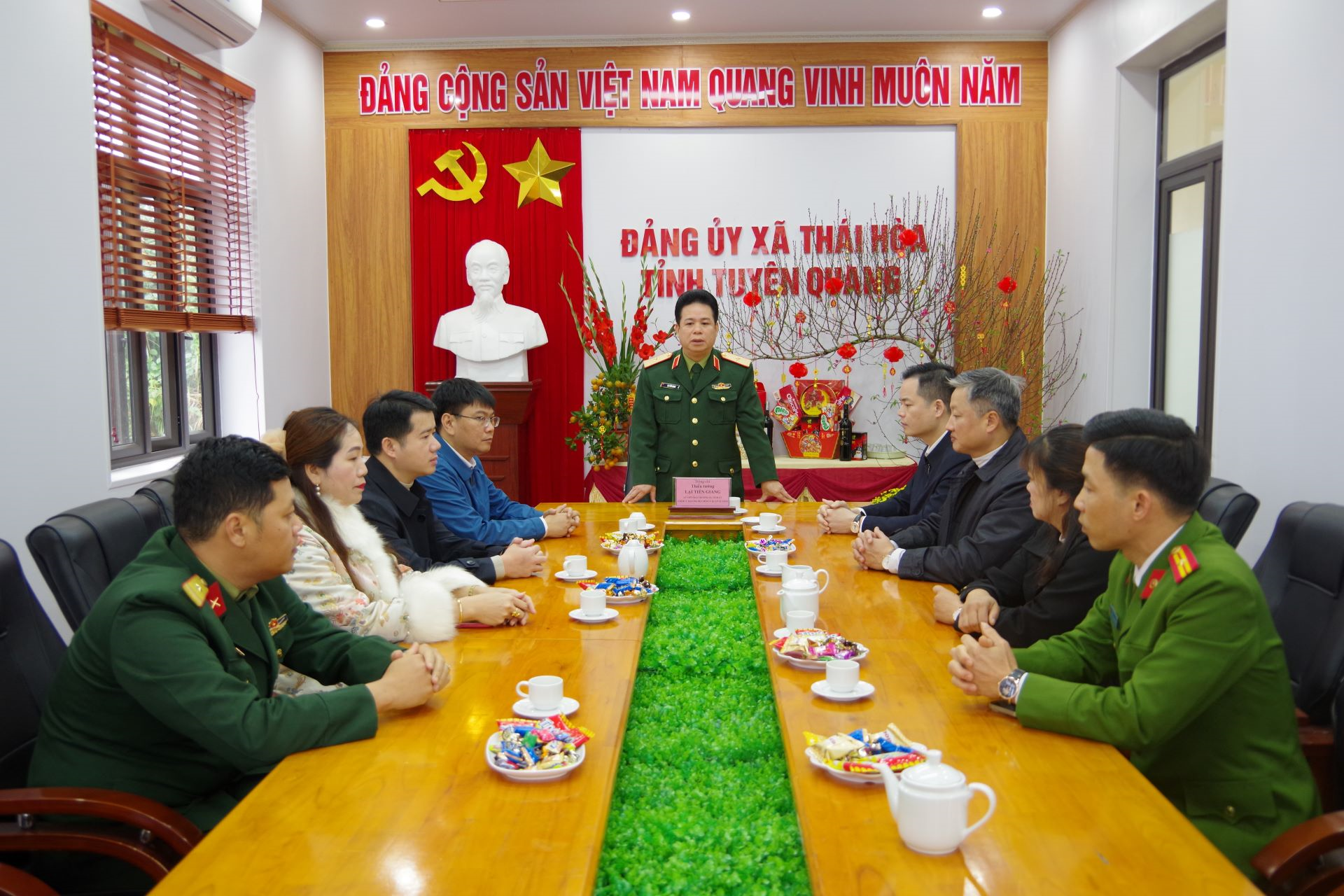 Thiếu tướng Lại Tiến Giang, Ủy viên Ban Thường vụ Tỉnh ủy, Chỉ huy trưởng Bộ CHQS tỉnh Tuyên Quang làm việc và chúc Tết Đảng ủy xã Thái Hòa, tỉnh Tuyên Quang, chỉ đạo công tác chuẩn bị bầu cử đại biểu Quốc hội khóa XVI và đại biểu HĐND các cấp nhiệm kỳ 2026-2031. Ảnh: ĐĂNG NINH