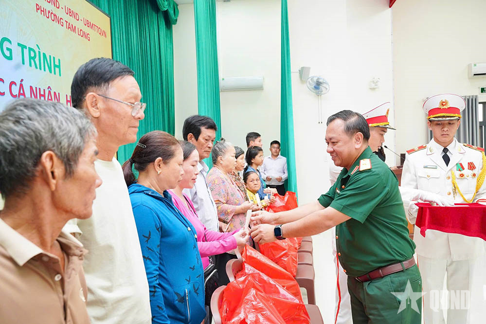 Thiếu tướng Nguyễn Thành Trung, Chính ủy Bộ tư lệnh TP Hồ Chí Minh tặng quà Tết các hộ dân phường Tam Long.