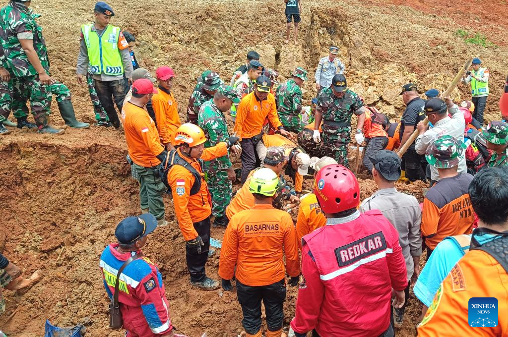 Cơ quan Khí tượng Indonesia đã ban hành cảnh báo thời tiết cực đoan vào đầu tuần này. Ảnh: Lực lượng cứu hộ làm việc tại khu vực vừa xảy ra trận lở đất ở làng Cibeunying. Ảnh: Xinhua.
