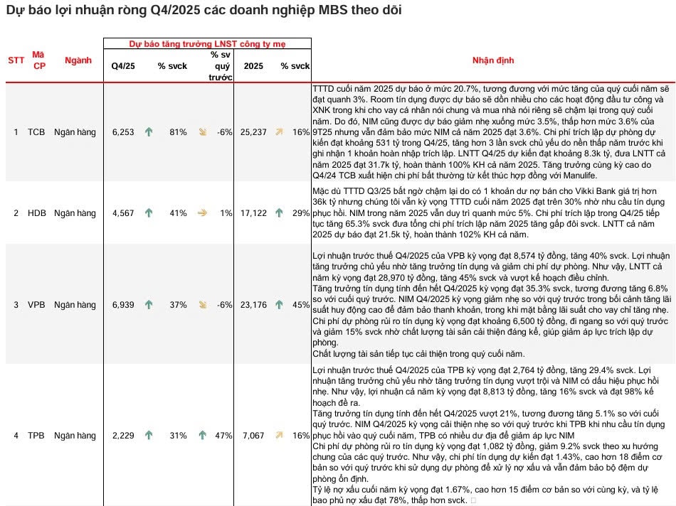 Con số dự báo được MBS đưa ra như sau: Techcombank dự kiến đạt 6.253 tỷ đồng lợi nhuận sau thuế trong quý 4, cả năm 2025 đạt mức 25.237 tỷ đồng, tăng lần lượt 81% so với cùng kỳ và 16% so với năm trước. HDBank đạt 4.567 tỷ đồng lợi nhuận sau thuế quý 4, cả năm đạt 17.122 tỷ đồng, tăng lần lượt 41% và 29%. VPBank đạt 6.939 tỷ đồng lợi nhuận sau thuế quý 4, cả năm đạt 23.176 tỷ đồng, lần lượt tăng 37% so với cùng kỳ và tăng 45% so với năm trước. Tiên Phong Bank đạt lợi nhuận sau thuế 2.229 tỷ đồng, cả năm 2025 đạt 7.067 tỷ đồng, lần lượt tăng 31% so với cùng kỳ và 16% so với năm 2024.