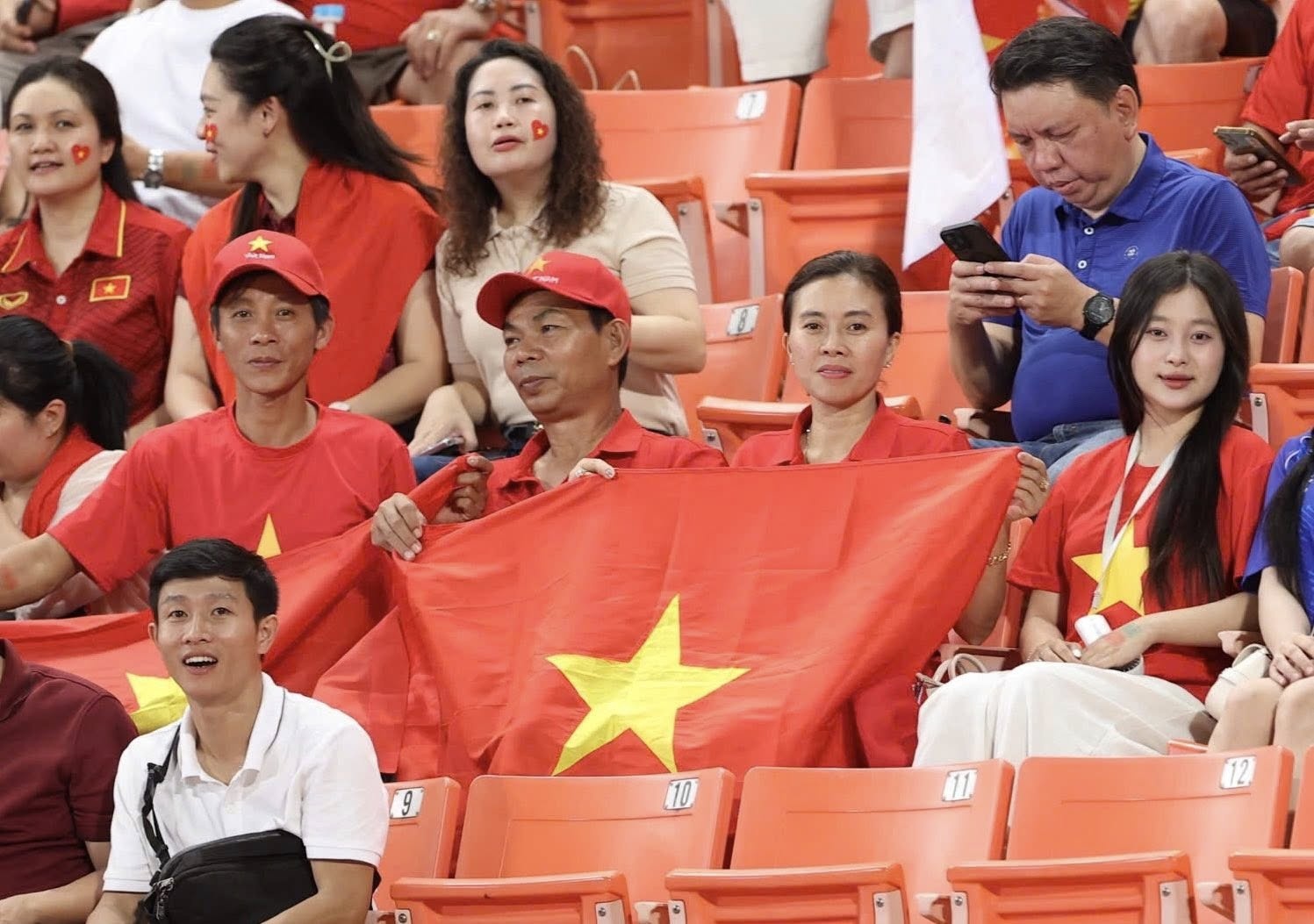 Thu Nguyệt (ngoài cùng bên phải) ngồi kế mẹ Lê Phát trên khán đài trận chung kết SEA Games 33. Ảnh: Lê Phát/Facebook.