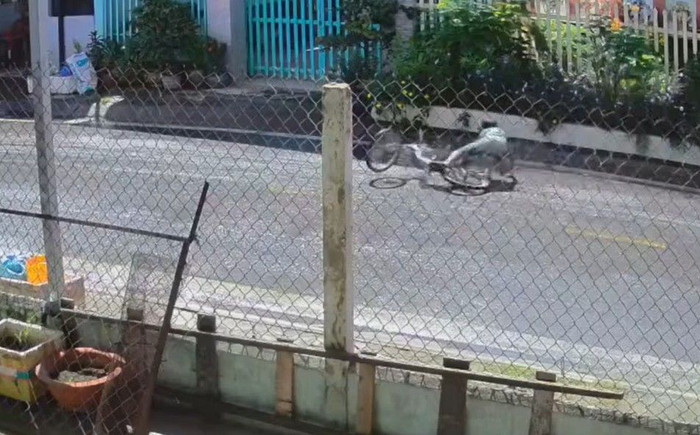 Bé trai đạp xe đuổi theo và không may bị ngã.