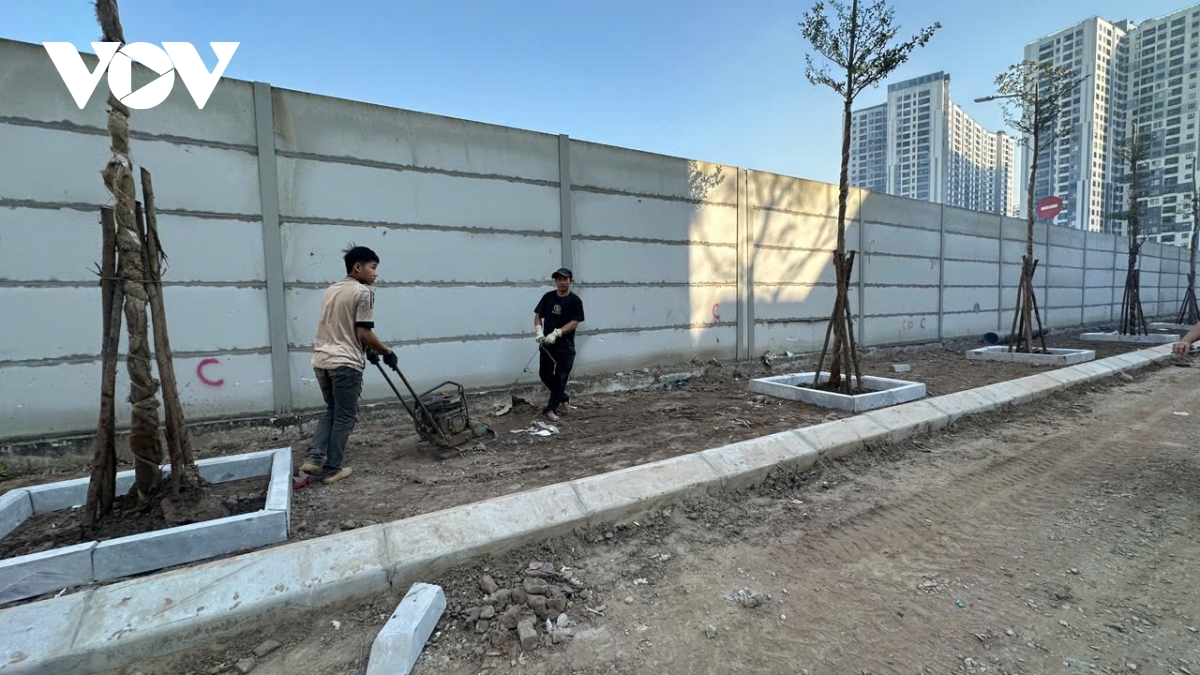 Một bên vỉa hè đã hoàn thành bó vỉa, trồng cây xanh.