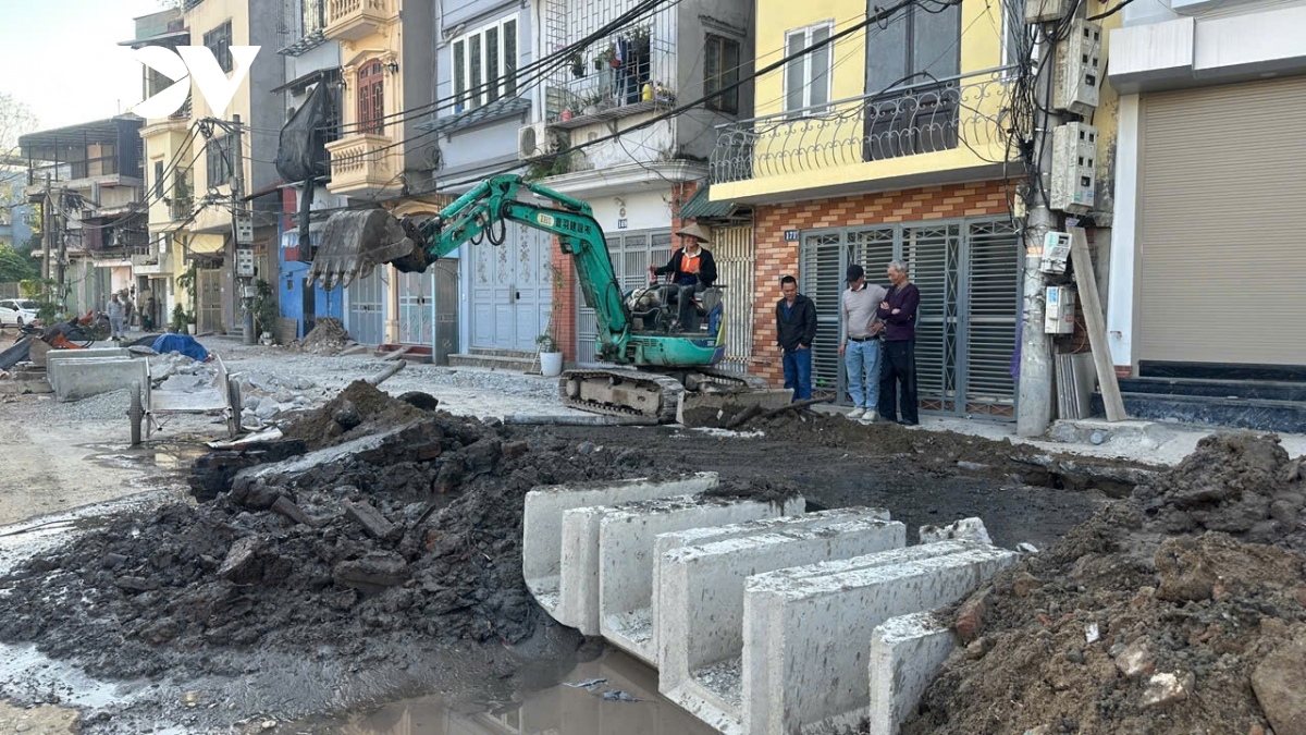 Nhà thầu đang làm nền cứng để chuẩn bị lát vỉa hè.