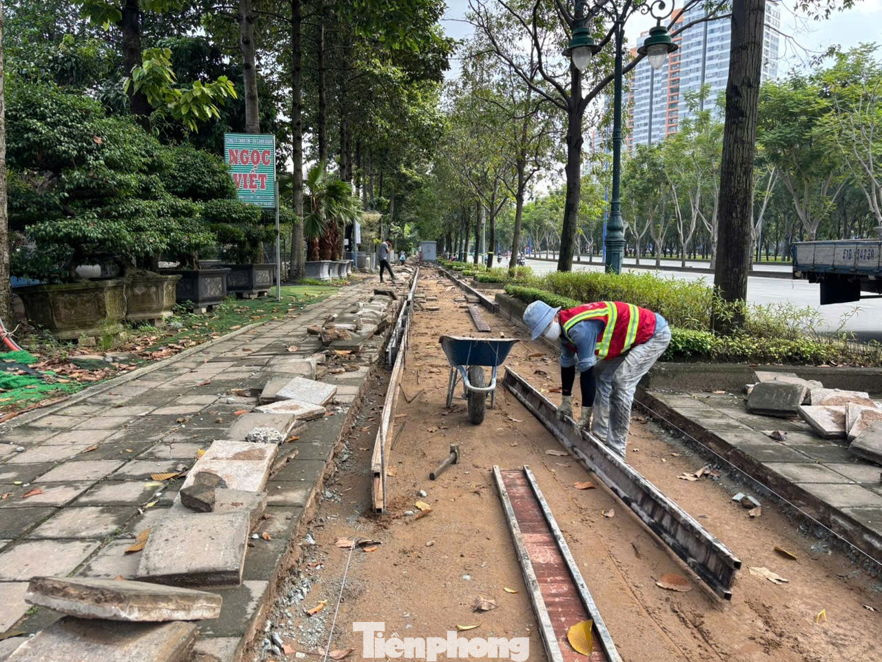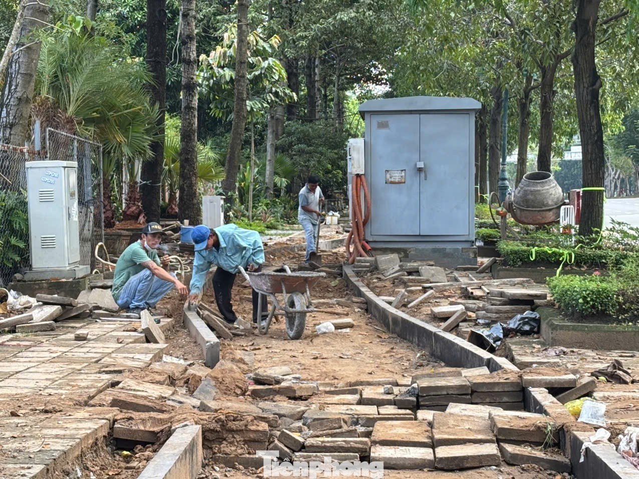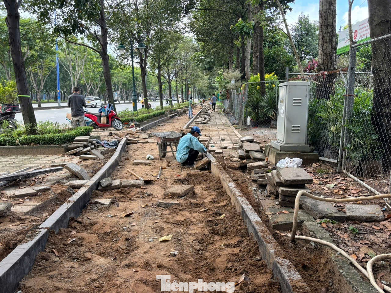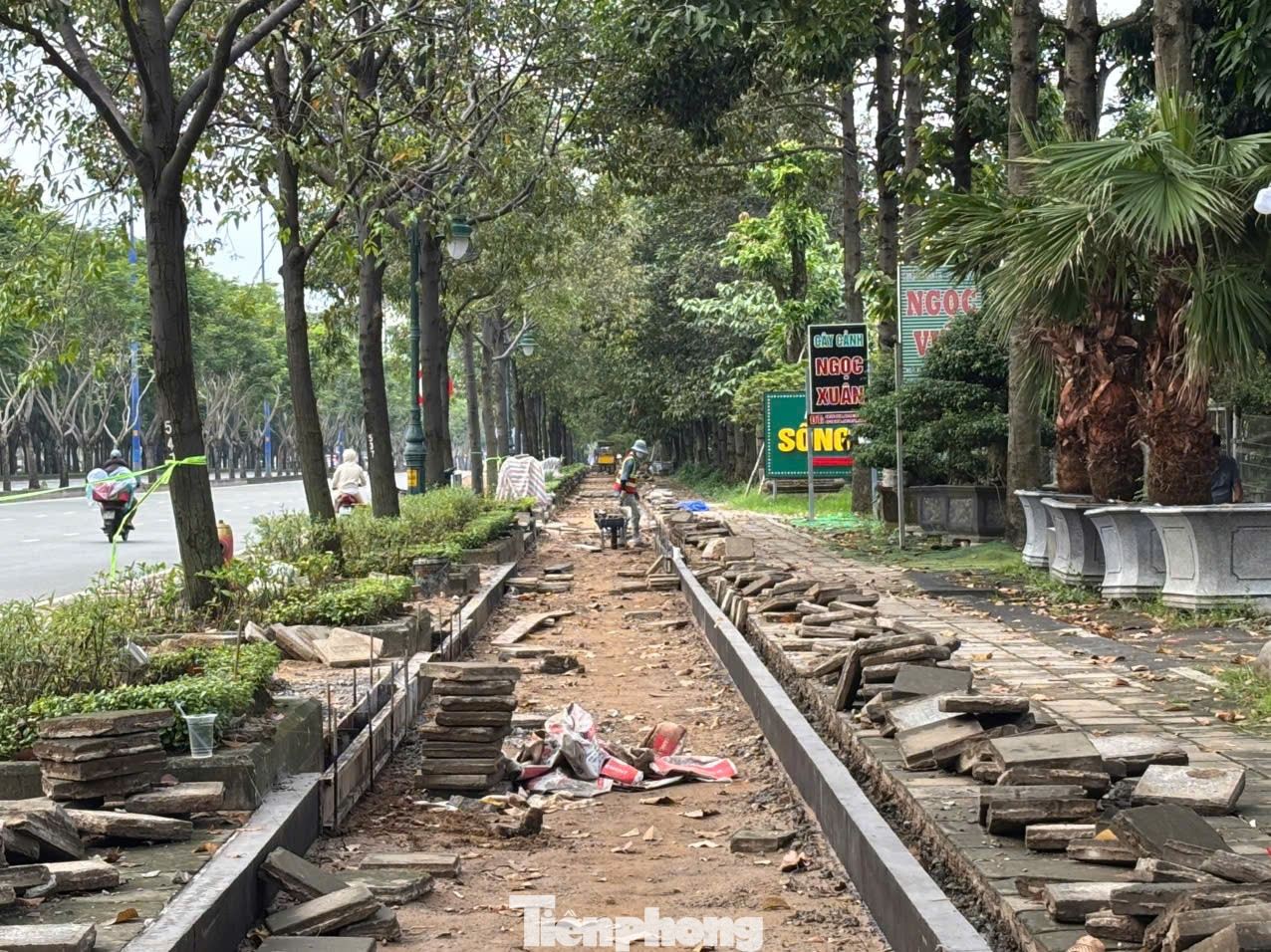 Các đoạn vỉa hè đang được bóc dỡ gạch để chuẩn bị mặt mặt bằng thi công.