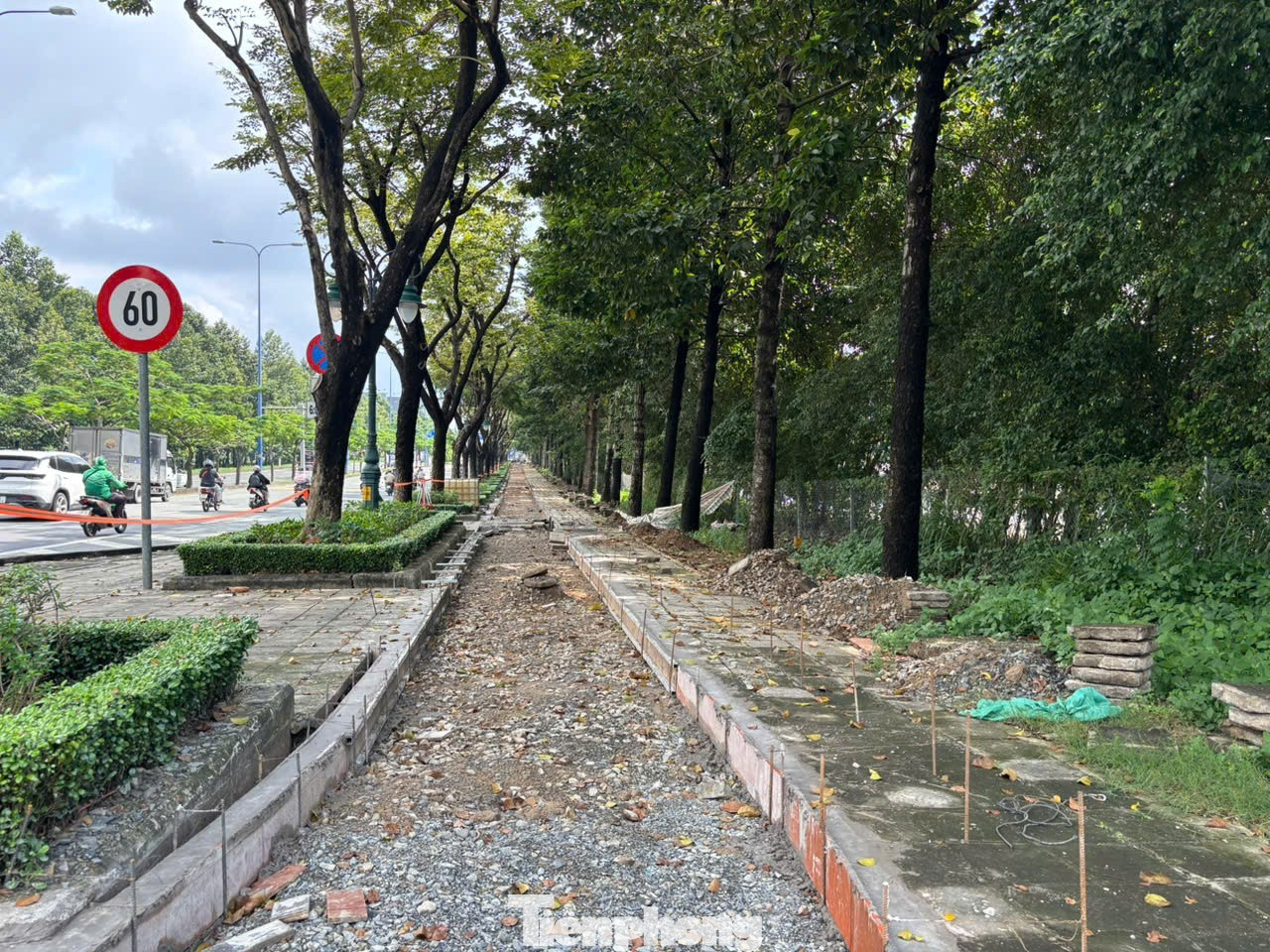 Công trường thi công làn xe đạp dọc vỉa hè đại lộ Mai Chí Thọ và đoạn giao Nguyễn Cơ Thạch đến đường D1 (phường An Khánh, TPHCM).