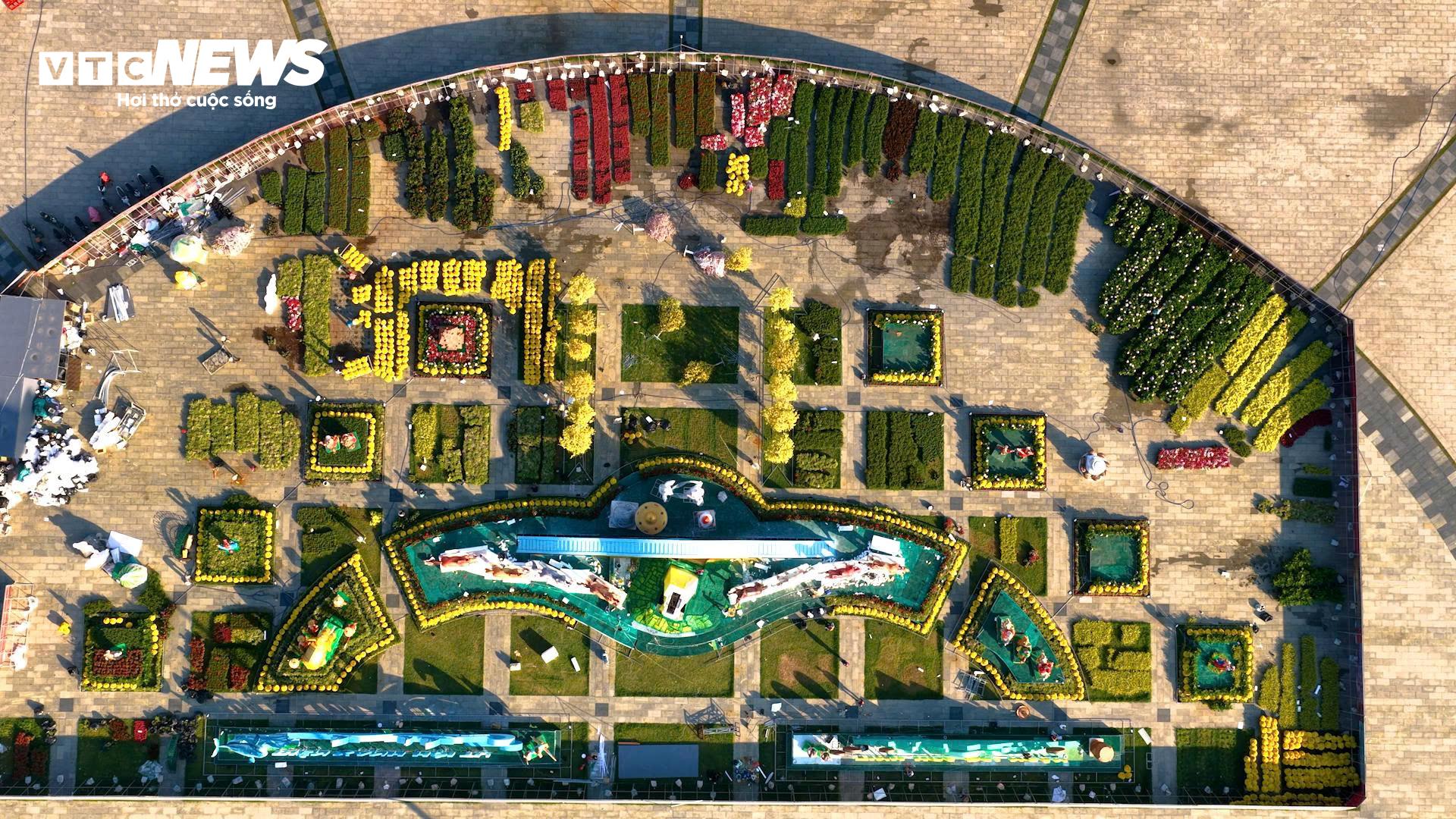 Nhìn từ trên cao xuống, tổng thể không gian trang trí cụm linh vật Xuân Bính Ngọ năm 2026 tại quảng trường Nguyễn Tất Thành năm nay được cách điệu như hình dáng một cây cung lớn với hai mũi tên Vàng hướng ra biển Đông.