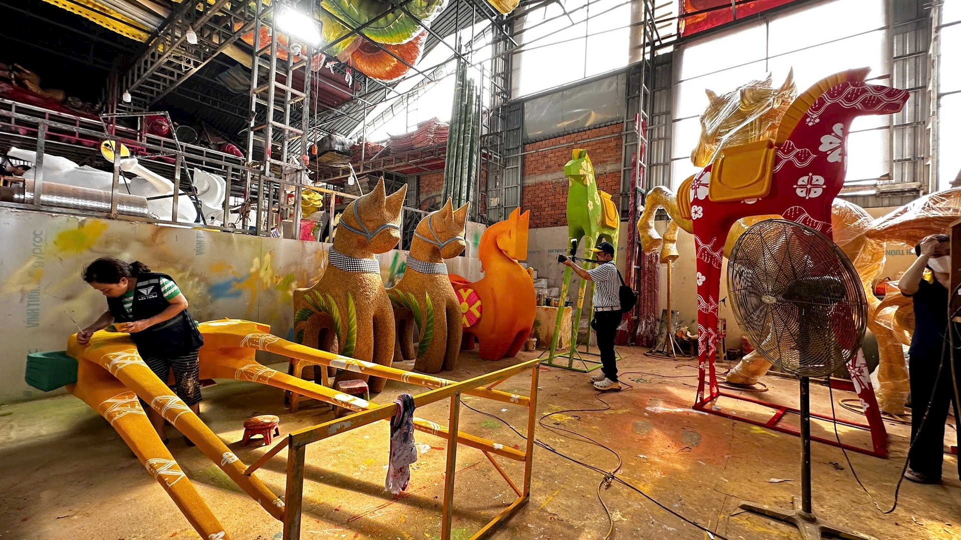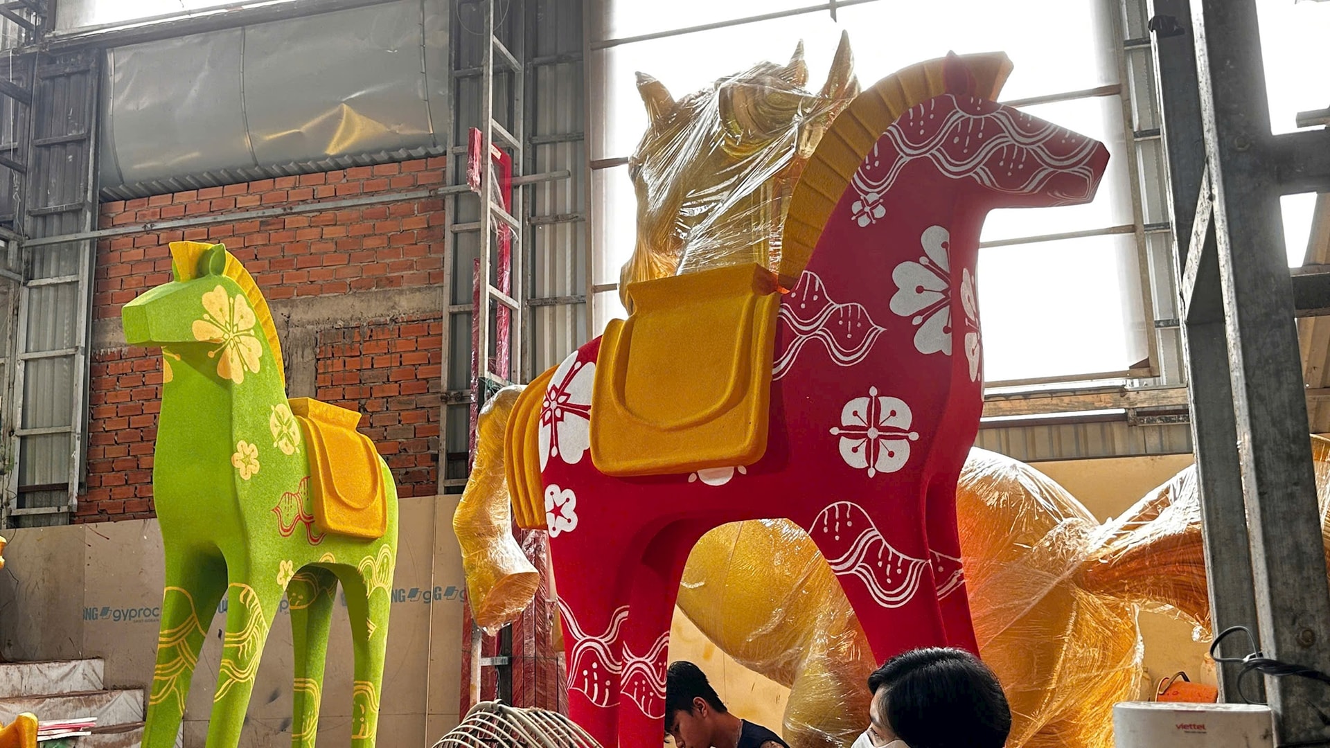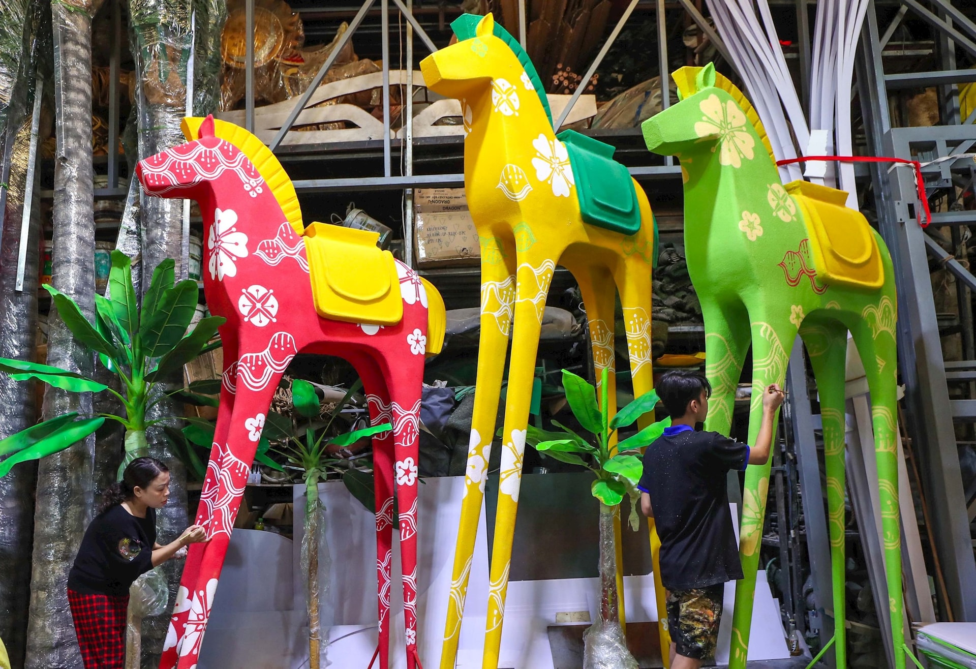 Các công nhân tất bật hoàn thiện những linh vật ngựa để đưa về trưng bày tại Đường hoa Nguyễn Huệ dịp Tết Bính Ngọ 2026. Ảnh: Nghiêm Ý