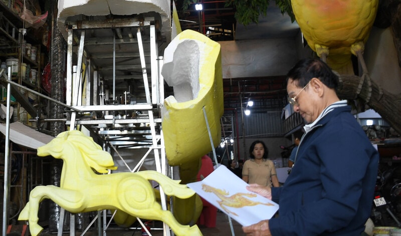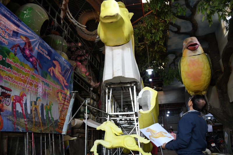 Chia sẻ với phóng viên Báo Hànôịmới, nghệ nhân Văn Tòng, Giám đốc Công ty TNHH Sản xuất Mỹ thuật Văn Tòng cho biết, Tết Bính Ngọ 2026, đơn vị vinh dự được giao chế tác linh vật ngựa - linh vật chính, đèn kéo quân lớn nhất từ trước đến nay, các linh vật ngựa nhỏ cho tiểu cảnh Đường hoa Nguyễn Huệ.