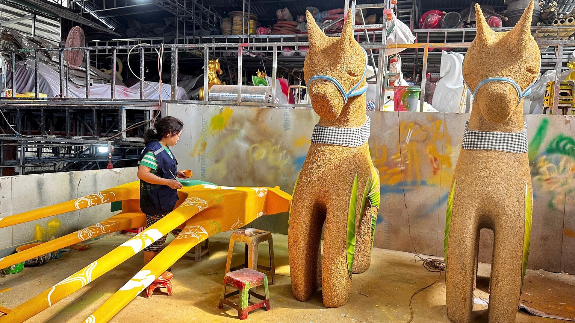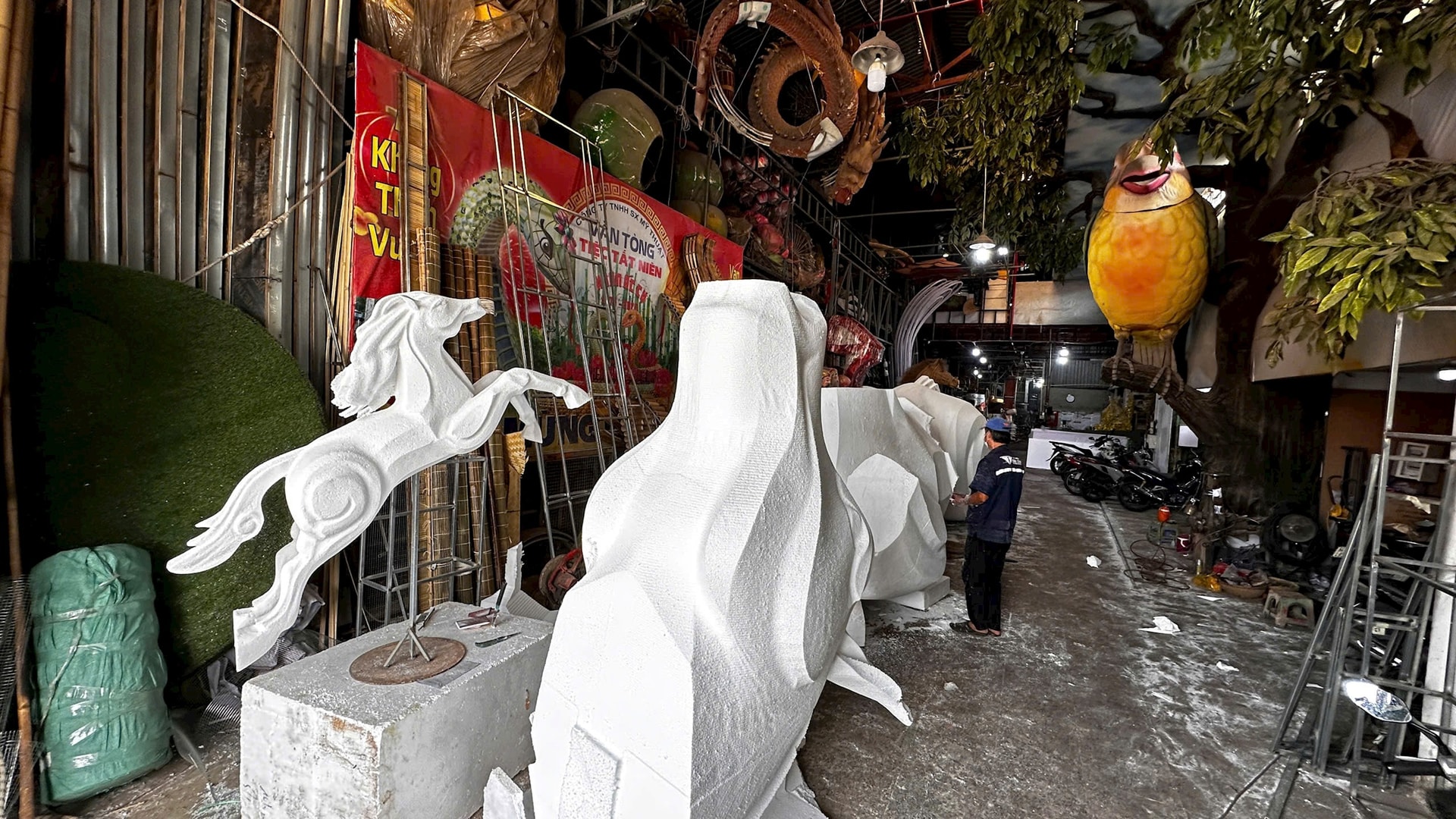 Tại xưởng chế tác của nghệ nhân Văn Tòng, những linh vật ngựa đầu tiên của Đường hoa Nguyễn Huệ Tết Bính Ngọ 2026 đã bắt đầu lộ diện. Ảnh: Nghiêm Ý.