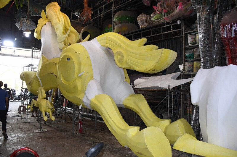 Nổi bật ngay lối vào nhà xưởng, linh vật ngựa cao gần 7 m đã được tạo hình. Đây là linh vật lớn nhất trong lịch sử đường hoa Nguyễn Huệ. Ảnh: Nghiêm Ý.