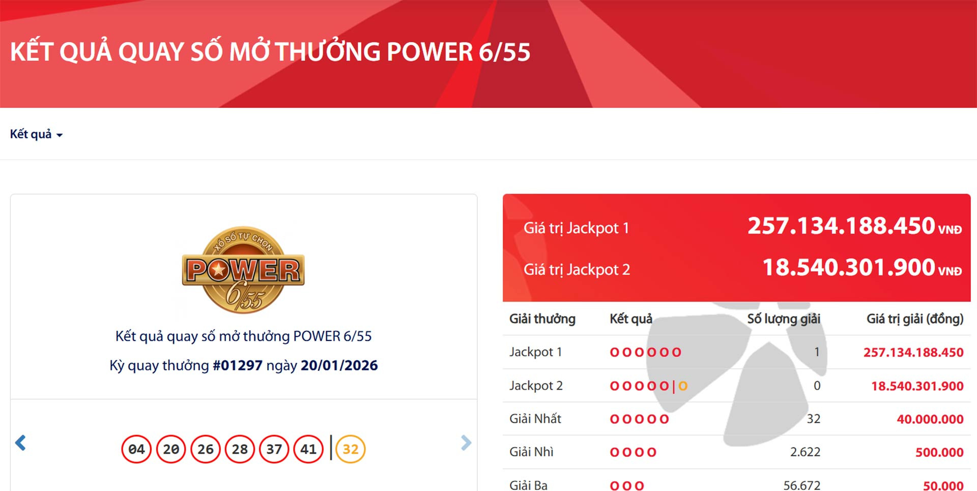 Tại kỳ quay số mở thưởng lần thứ 1.297 ở loại hình xổ số Power 6/55 của Công ty Xổ số Điện toán Việt Nam (Vietlott) diễn ra tối qua (20/1), hội đồng quay thưởng đã tìm thấy một vé số trúng giải độc đắc Jackpot 1 trị giá hơn 257 tỷ đồng. Giải thưởng này đã được tích lũy trong hơn ba tháng.