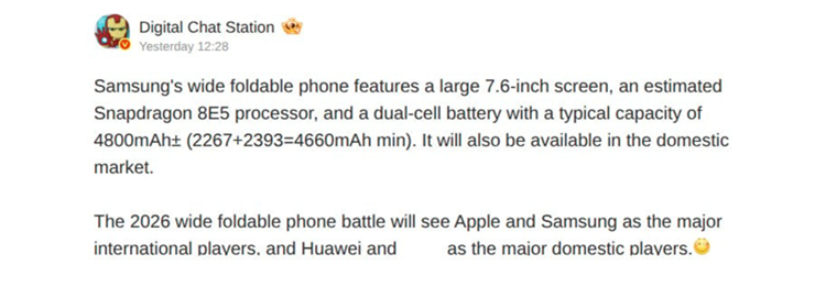 Theo những thông tin rò rỉ mới nhất từ chuyên gia tin đồn Digital Chat Station, mẫu máy gập màn hình rộng này sẽ không hề kém cạnh các flagship hàng đầu khi sở hữu con chip Snapdragon 8 Elite Gen 5 mạnh mẽ nhất. Cấu hình này giúp máy vận hành mượt mà mọi tác vụ đa nhiệm nặng nề trên màn hình lớn, vốn là thế mạnh của dòng máy gập.