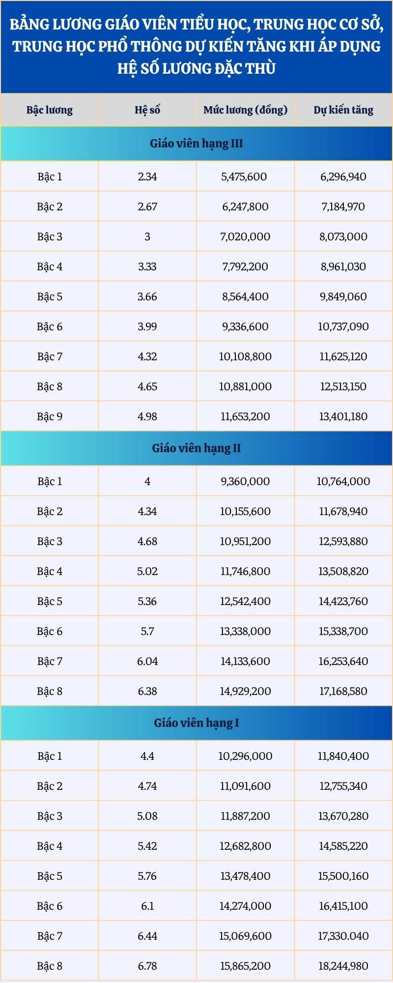 Bảng lương với giáo viên tiểu học, trung học cơ sở, trung học phổ thông nếu có thêm hệ số đặc thù như đề xuất của Bộ Giáo dục và Đào tạo. Bảng biểu: Linh Nguyễn