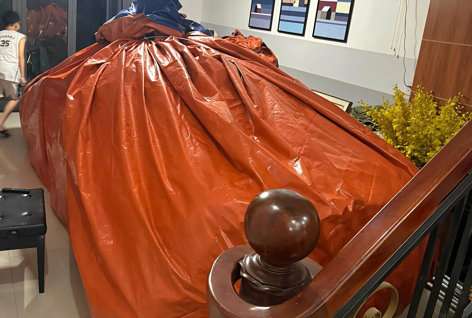 Theo đó, anh Trần Thanh Nguyên (trú tổ 18, phường Thanh Khê) dùng tấm bạt lớn trải dưới nền nhà, rồi cho ô tô chạy lên, sau đó phủ kín toàn bộ xe, cố định bằng dây.