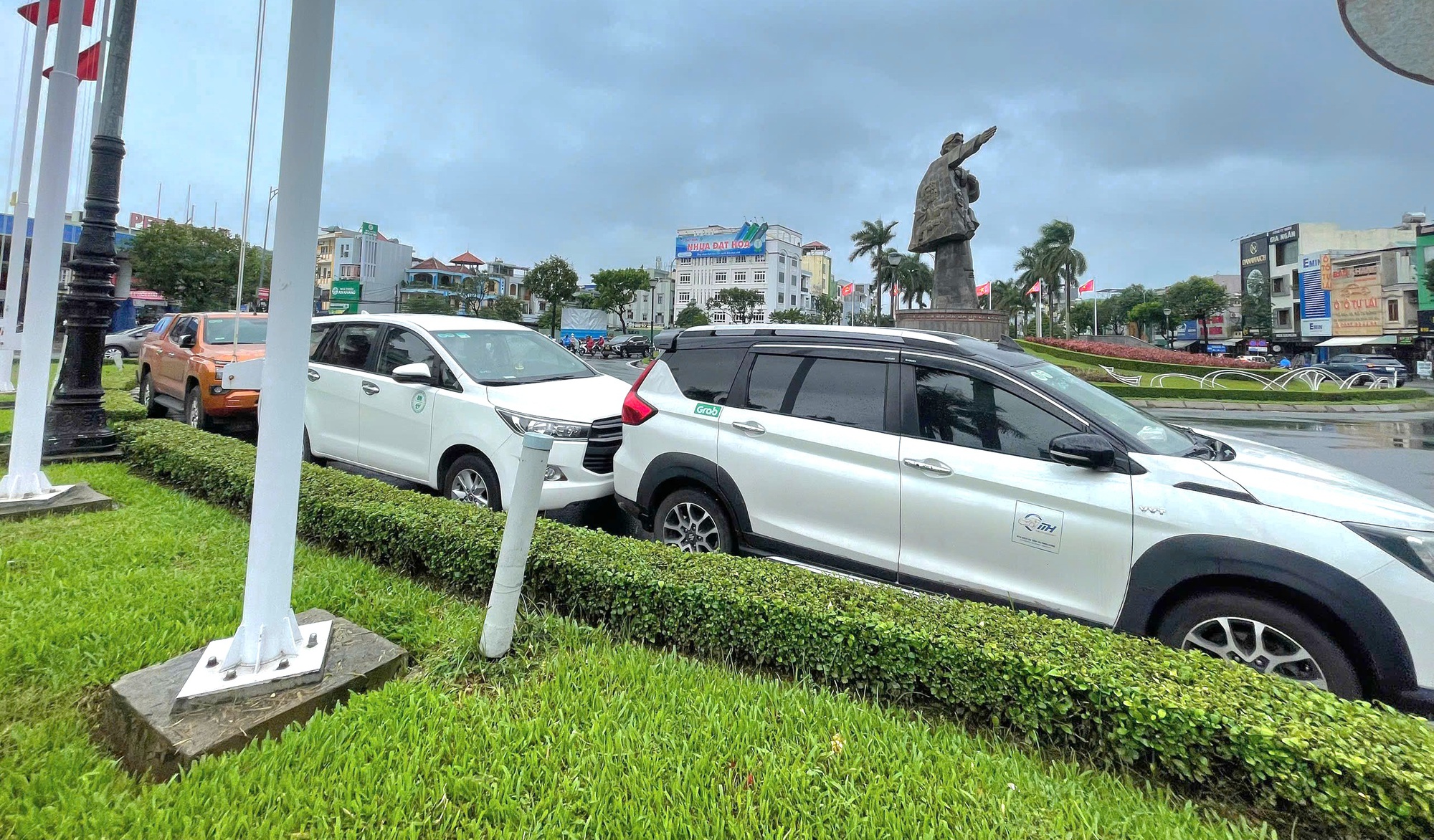Nhiều ô tô đỗ quanh vòng xuyến tượng đài Mẹ Nhu vì lo ngại ngập lụt.