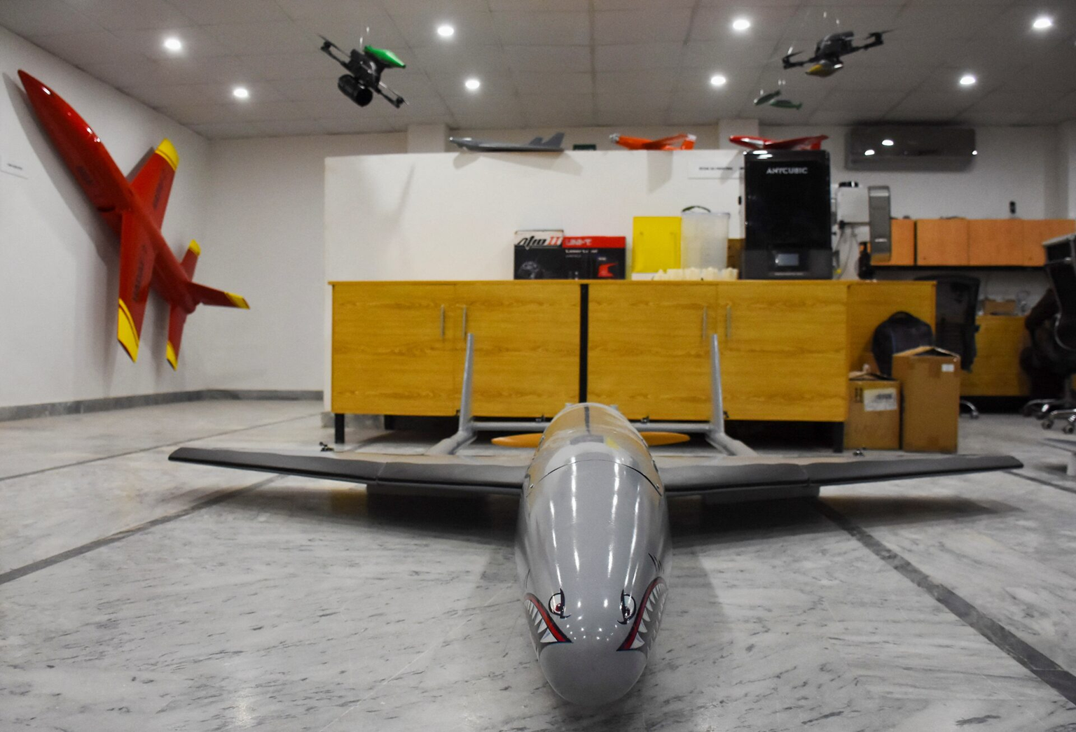 Các mô hình máy bay không người lái tấn công được trưng bày tại công ty Sysverve Aerospace Private Limited ở Rawalpindi, Pakistan, ngày 16.1 - Ảnh: Reuters