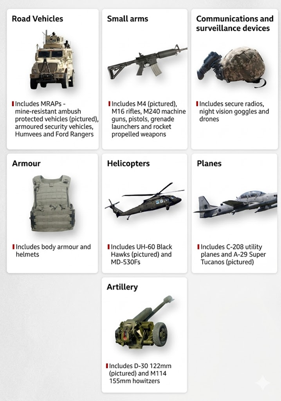 Các loại vũ khí và khí tài mà Mỹ từng viện trợ cho quân đội Afghanistan trước năm 2021 và sau đó rơi vào tay Taliban khi Mỹ rút quân - Ảnh: Getty