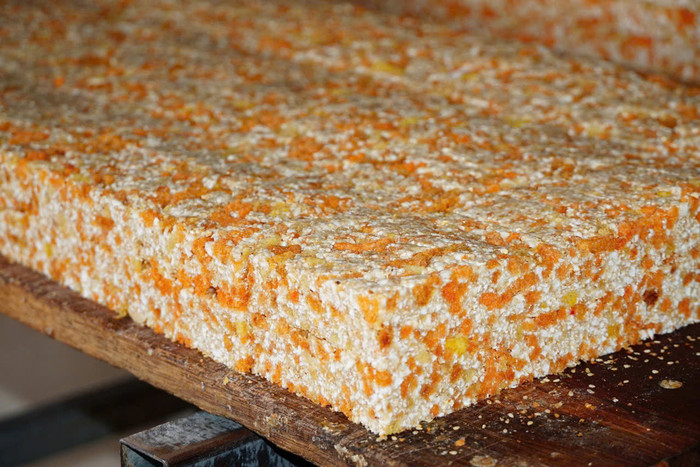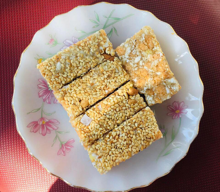 Người làm bánh phải chọn loại nếp ngon nhất, hạt đều, đem rang chín rồi giã nhỏ. Lạc và vừng được rang vừa tới để giữ độ bùi, mứt bí và mỡ phần thái nhỏ rồi rim cùng đường cho lên màu óng đẹp. Tất cả được trộn đều với nước đường nấu cô lại vừa phải, sau đó ép thành khuôn, để nguội, rồi cắt thành miếng vuông vức.