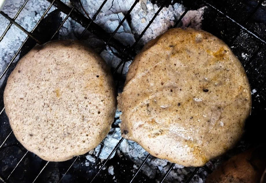 Bột sau khi xay được nhào với nước theo tỉ lệ bí quyết, tạo thành khối bột dẻo thơm, rồi nặn thành chiếc bánh to bằng cả bàn tay, dày 2–3cm. Bánh được hấp trước để giữ độ ẩm, sau đó nướng trên bếp than hồng – nơi hương thơm núi rừng thật sự “thức giấc”. Ảnh Minh Thu