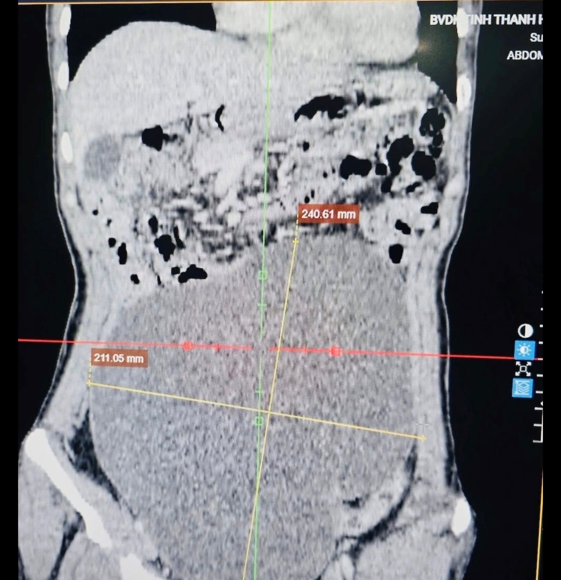 Tại bệnh viện, kết quả chụp cắt lớp vi tính (CLVT) ổ bụng cho thấy một khối u kích thước rất lớn, chiếm gần toàn bộ ổ bụng, kéo dài từ hạ vị đến thượng vị, xuất phát từ buồng trứng.